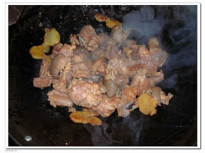 2.用花生油爆香薑片(3片),再加入排骨爆炒;