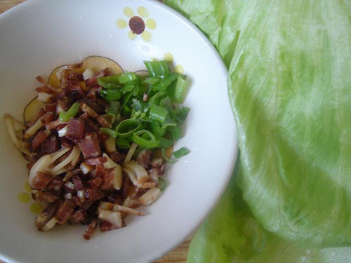 2、切臘肉蔥,還有生菜,一定要保持生菜的完整