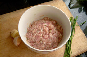 1、豬肉餡加澱粉、生抽、鹽、紹興酒和勻。