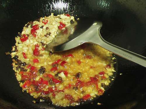 3、出辣味和麻味後,放入薑蒜片,泡椒,泡薑(蔥先不要放)