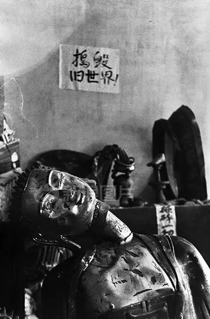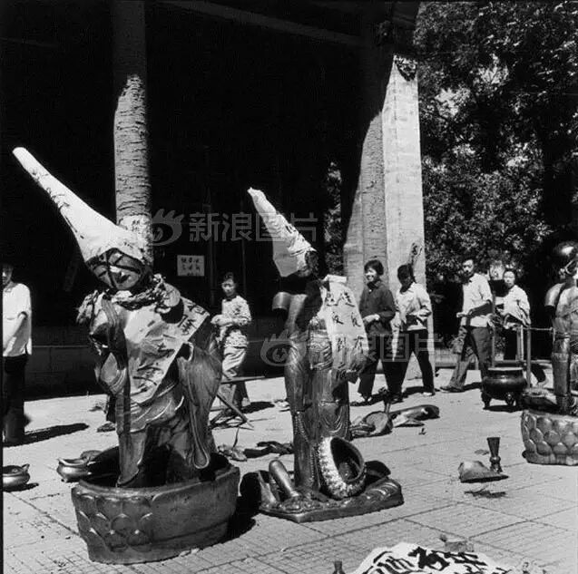 當天,極樂寺門口人山人海,四門都坐滿了人。那些無法搬動的佛像,紅衛兵就地砸毀。這個寺廟裏的和尚後來都進了製釘廠工作,直到文革結束後才回到寺廟。圖為極樂寺的鎏金佛像被紅衛兵搗毀砸碎。攝影|李振盛
