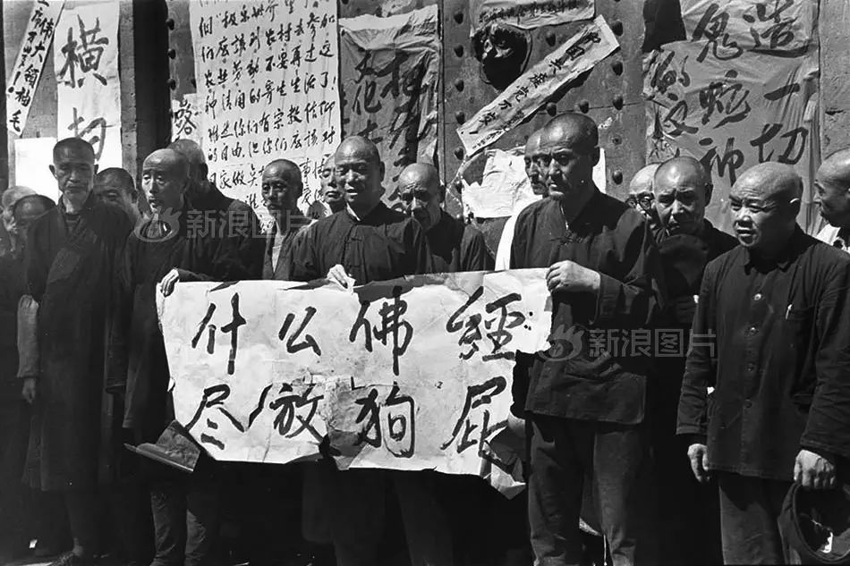 紅衛兵逼迫哈爾濱極樂寺和尚扯起“什麽佛經,盡放狗屁”的橫幅自辱門楣。右一手拿帽子的和尚是後來的極樂寺方丈慈法大師,1966年他53歲,是廟裏最年輕的和尚,他帶著紅衛兵來造自己寺廟的反,不過被不知情的紅衛兵抓住了,也來示眾。攝影|李振盛