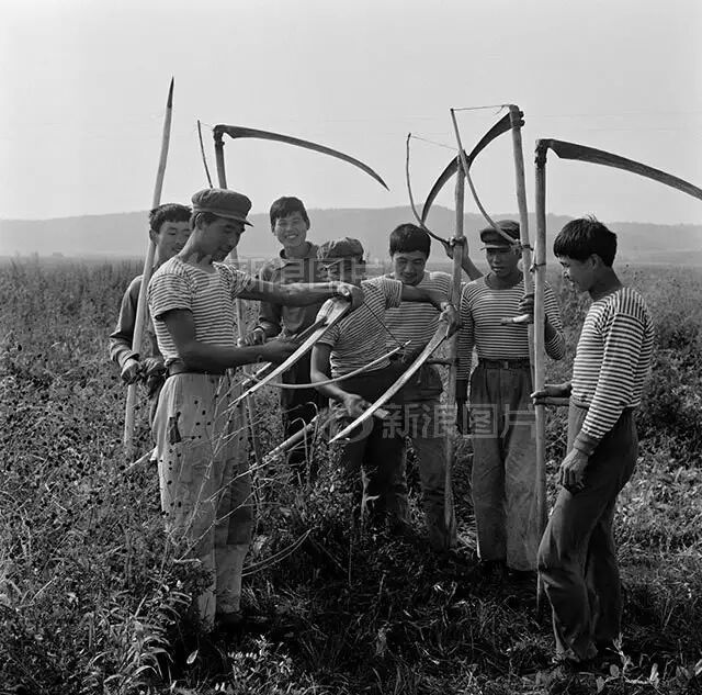 1972年9月5日,黑龍江省遜克縣,知識青年在荒原上割草間歇,互相交流磨大扇刀的技術。攝影|李振盛