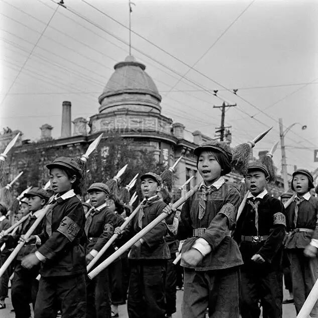 1966年10月1日,哈爾濱市南崗區大直街秋林公司門前,小學生肩扛紅纓槍參加文革中的第一個國慶節遊行。攝影|李振盛