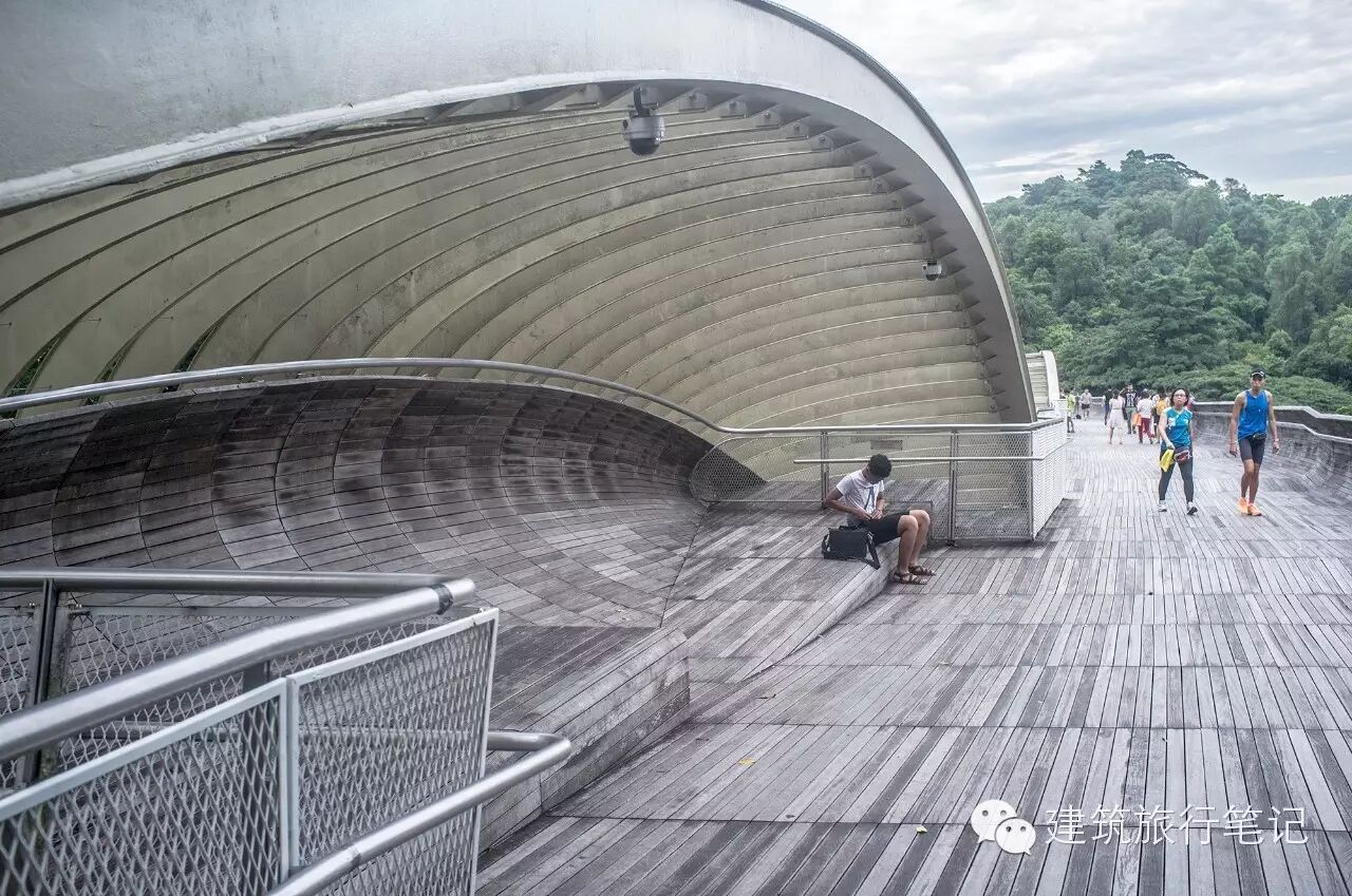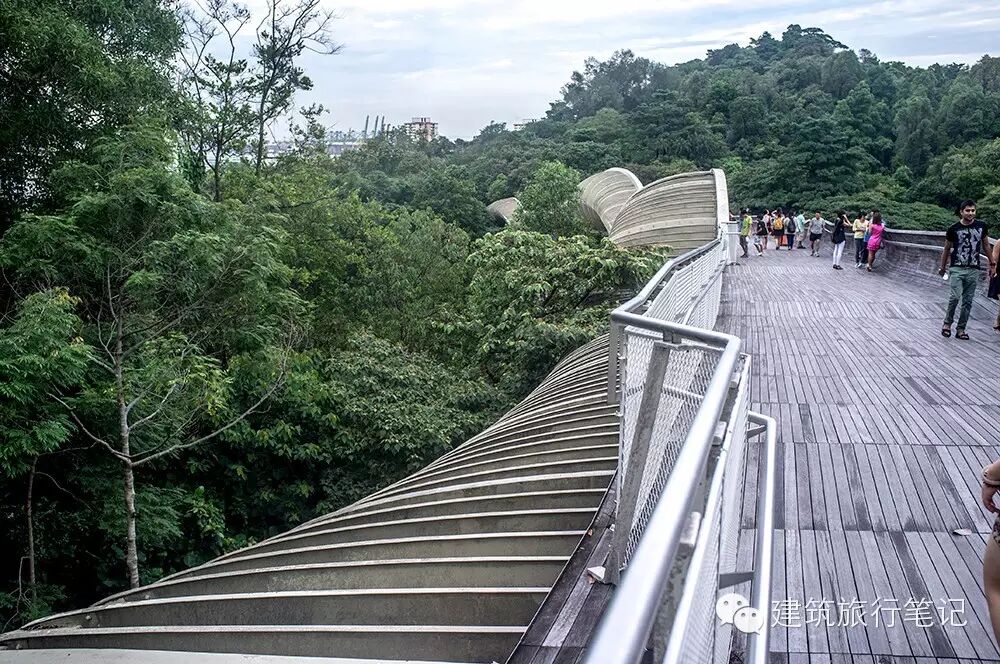 點評:亨德申波浪橋也是新加坡最高的人行天橋,是徒步南部山脊一定會經過的一座橋,波浪橋全長274米,最高點離開路麵36米,約等於12層樓高的組屋。橋身猶如後浪推前浪,有4個波峰和3個波穀,八米寬的橋身就在波峰浪穀之間穿過。拱起的波峰也是遮篷,遮篷下有長凳讓遊人休憩,從這裏眺望城市非常漂亮。橋身從花柏山向直落布蘭雅山攀升,兩端落差20公尺。全橋采取無障礙設計,沒有梯級,設有扶手,橋麵防滑,方便老人及坐輪椅者。