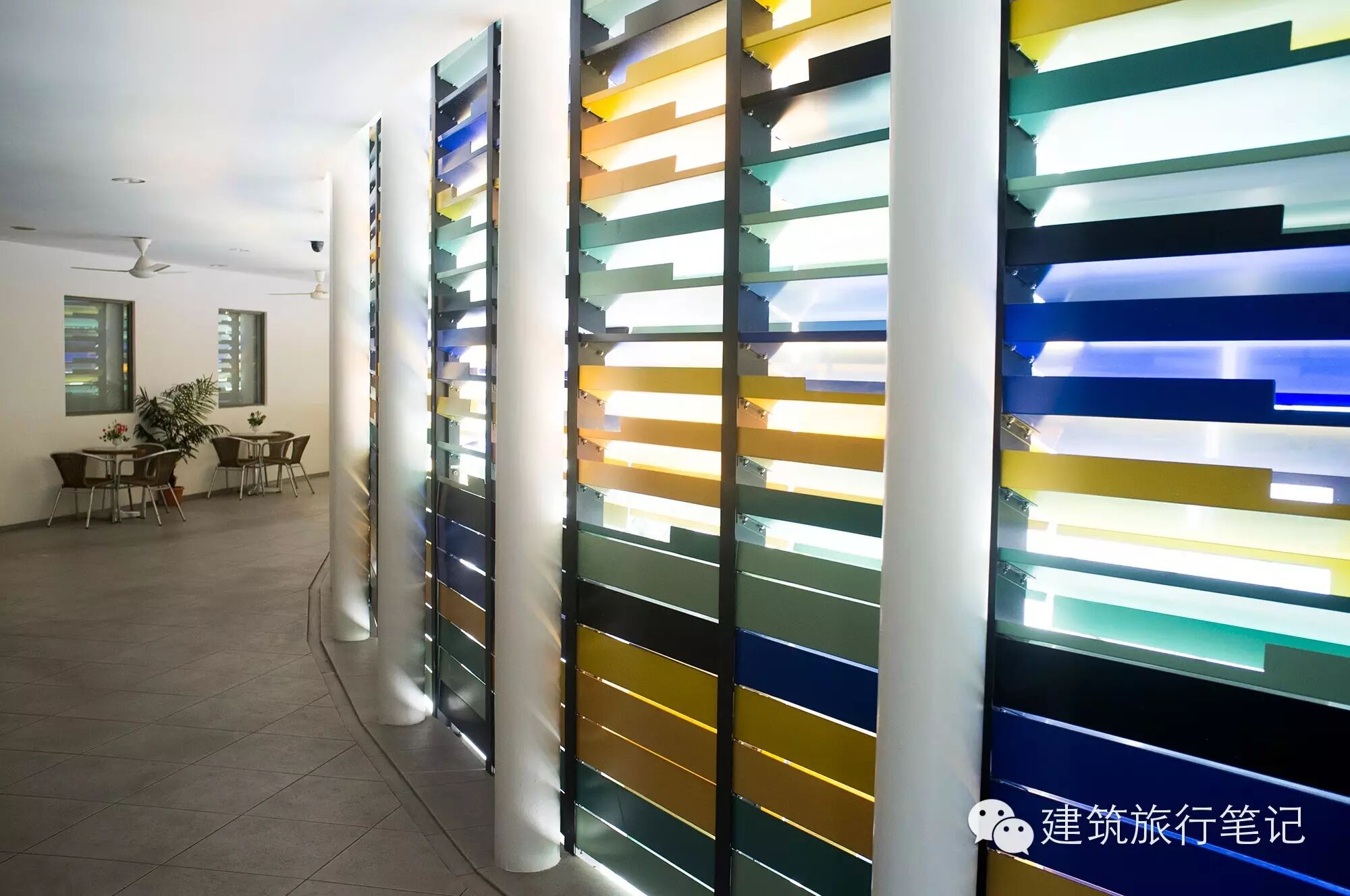 綠色外牆充當了室內環境的過濾器,阻擋外界的眩光和灰塵,保持室內的涼爽。立麵上,建築師鋪設了分層網格,屏幕和連接建築的多層水槽,為藤蔓植物的生長創造了環境。預製的種植器裝在廊道外牆,便於植物的接觸和生長。