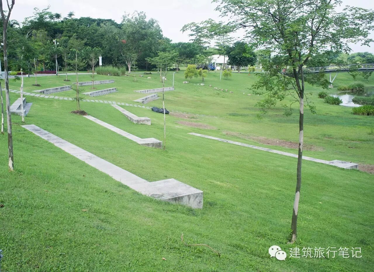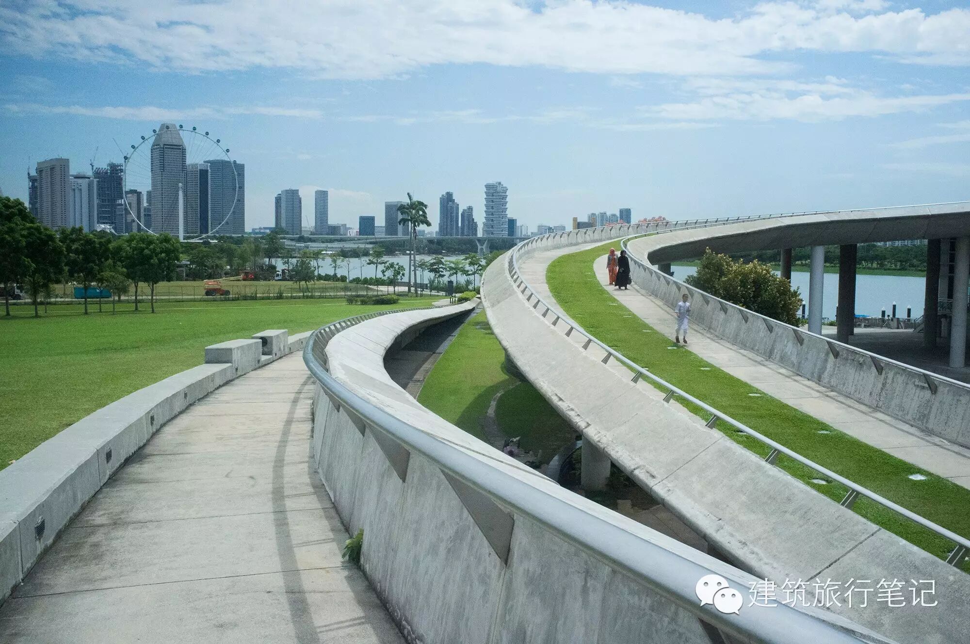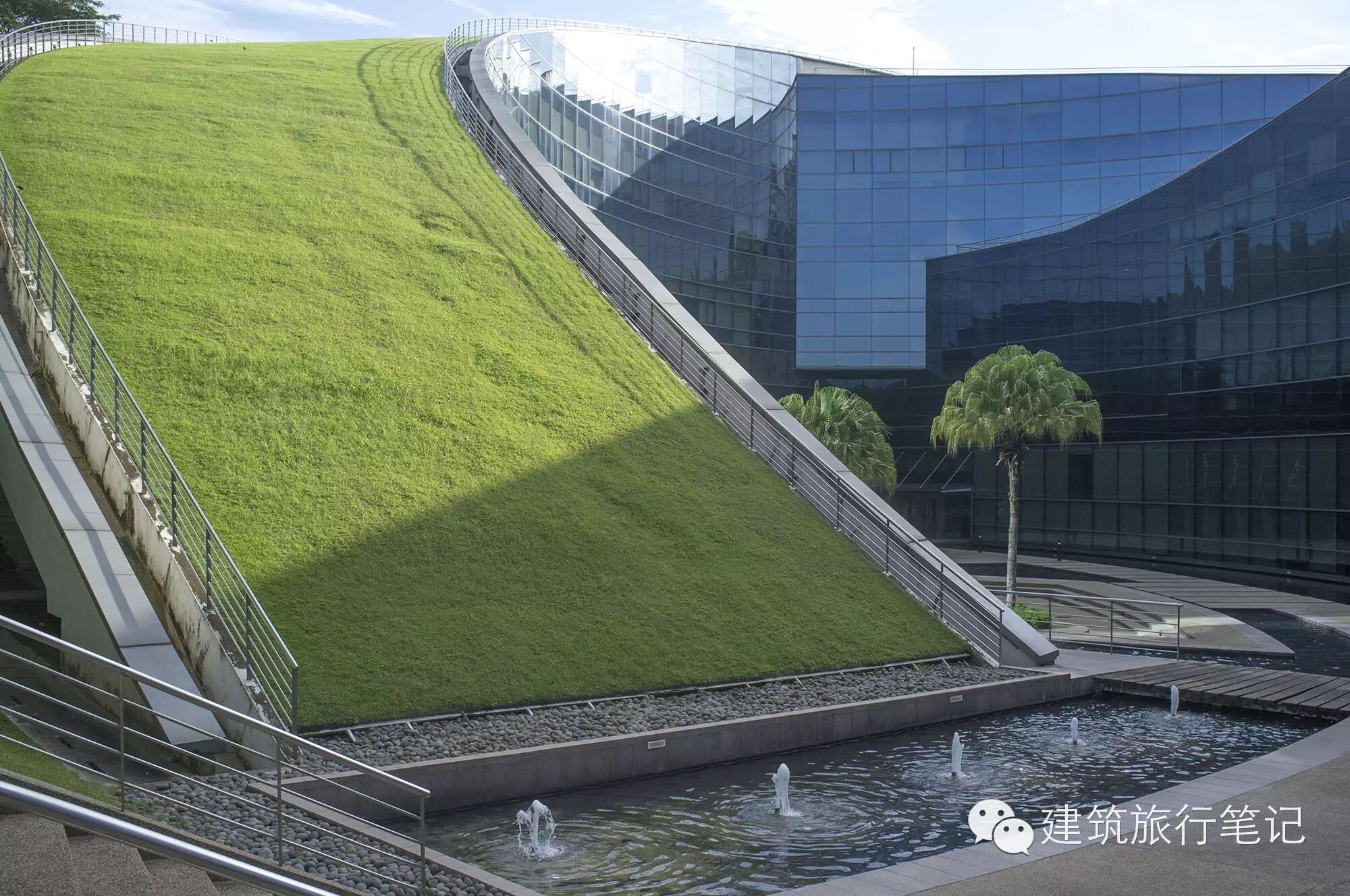 點評:景觀堤壩也是走覆土建築路線的,和南洋理工的藝術設計樓是一個概念。主樓屋頂鋪上了環迴 180 度的草皮,從高處俯瞰,濱海堤壩的外形好像一個綠色的旋渦,所以光是從造型意向來看確實是個成功的建築,但是要說新意的話,隻能just so so了。