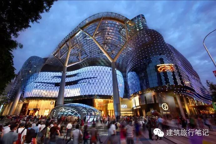 點評:ION Orchard Shopping Mal不用我說,它也幾乎成了新加坡的地標了,特別是入口空間,真實的站在它的底下還是很能感受到它的震撼的。IONOrchard的設計靈感來源於場地的曆史背景,設計師將其比喻為一枚掉落在果園裏的種子,並在這裏生根發芽。入口處如波浪般起伏的天棚,由幾根形似樹幹的立柱支撐,而由玻璃和金屬框架構成的錯綜複雜的模塊狀天棚表麵,則來自於樹冠紋理的啟發。