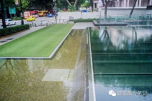 此地下工程位於新加坡曆史保護區中心,因此需要在設計時盡量不破壞此地區的景觀,而這與利用地麵視覺景觀來為“地鐵族”增加短途旅行的體驗成了一對非常棘手的矛盾。設計師用了非常簡單的設計策略輕而易舉地解決了這個問題:涵水玻璃天窗作為地鐵站屋頂的同時,也被設計成景觀元素。設計努力為在區域行政中心上班的“地鐵族”和參觀者創造歡樂的氣氛,把它看作映景的水幕還是沉沒的天窗,隨欣賞者的心情。地鐵站與博物館位於同一軸線,形成的大片空地成為了通向博物館、大教堂和新加坡管理大學圖書館的市民廣場區。