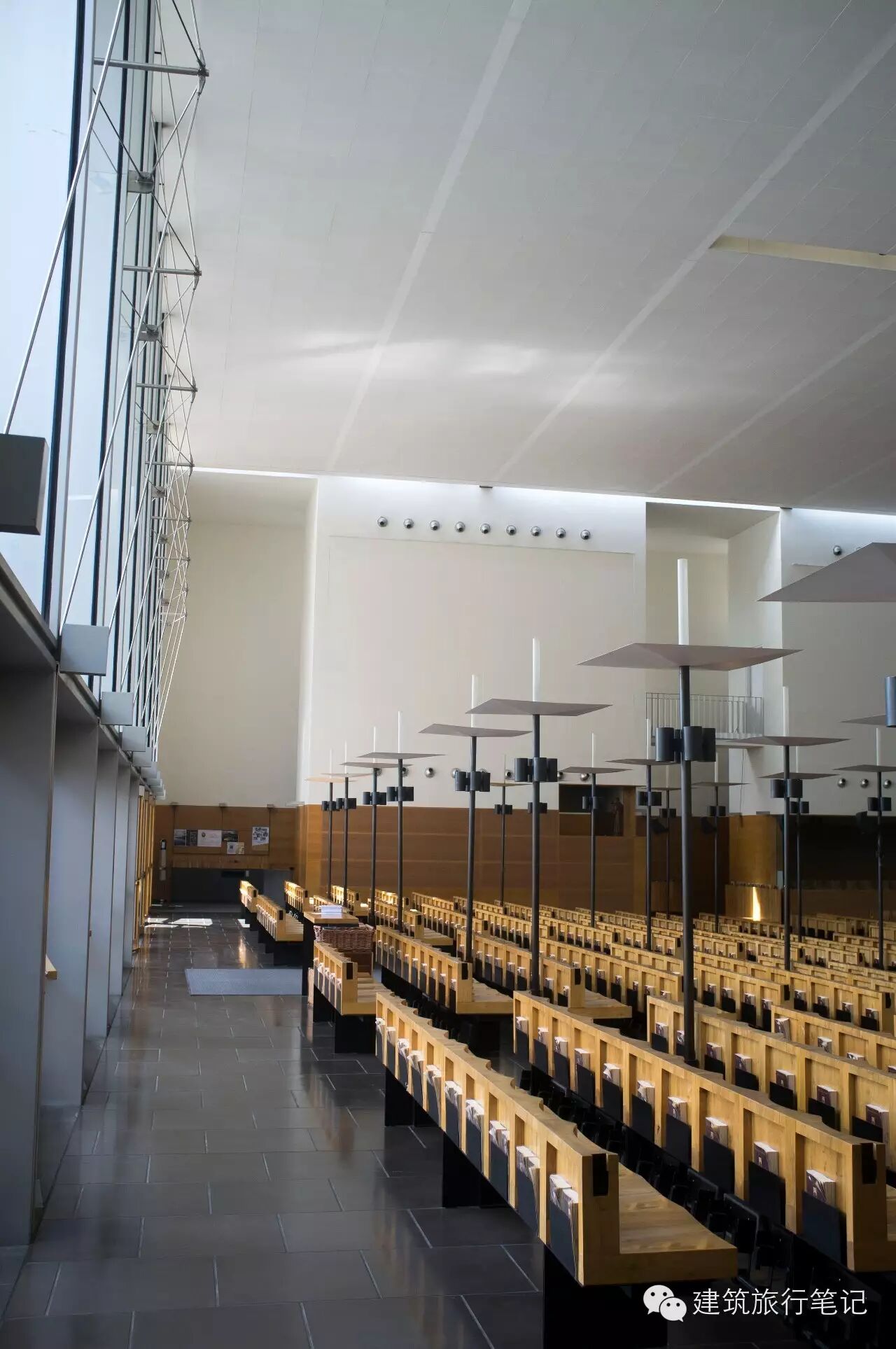 點評:這個教堂還是有點難找的,門小小的,在一個緩坡上,要上幾級台階才能到入口,一進小門,眼前偌大的庭院層層遞進,豁然開朗,所以整個布局就是有意思並且有些小心思的。由於場地局限,教堂建築隻有一個麵是開向遊客的,於是就索性把這個立麵用大玻璃幕牆整個打開,最極致的模糊了建築與場地的界限。還有一個有趣的地方是把臨終是的功能結合場地安排在了庭院地下空間,不僅遠離正常的禮拜區域,並且很好的隱藏在了綠化之中。