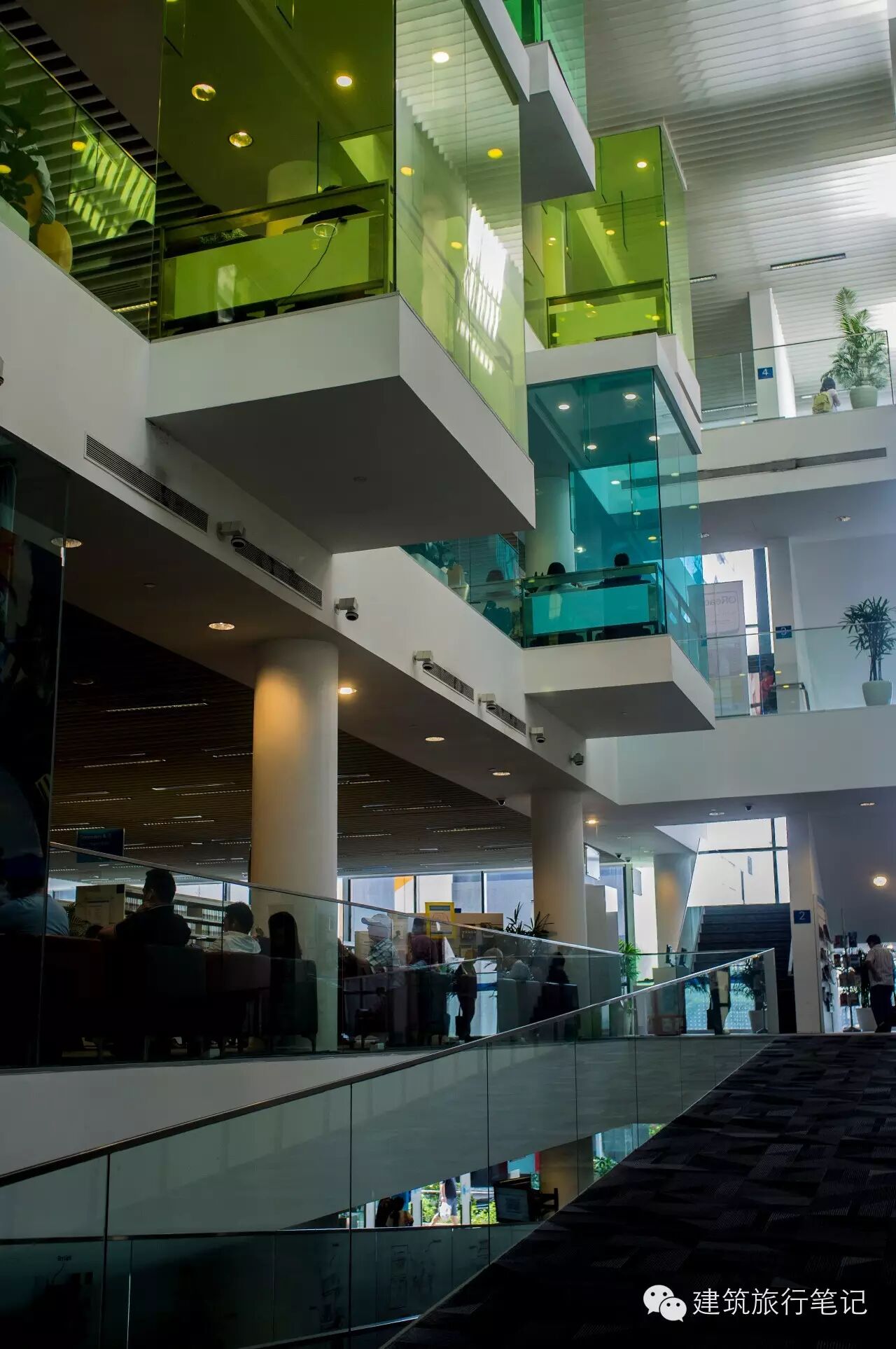 點評:碧山社區圖書館就在碧山地鐵站附近,搶眼的外形我相信你一眼就找到了。我到的時候正好是中午午飯時間,卻被新加坡民眾的學習熱情著實嚇了一大跳,幾乎所有的位置都被占據,很多都是西裝革履的上班族,利用午休時間充電。圖書館的兩大特點其一就是彩色的盒子裝飾出的主立麵,每個懸挑的盒子都是一個閱讀和討論空間,並且都已經被孩子們占領了;另外一個特點是集中在建築一側的交通空間,四層通高並且也有彩色盒子懸挑出來,形成一個步移景異的空間效果,非常有趣。