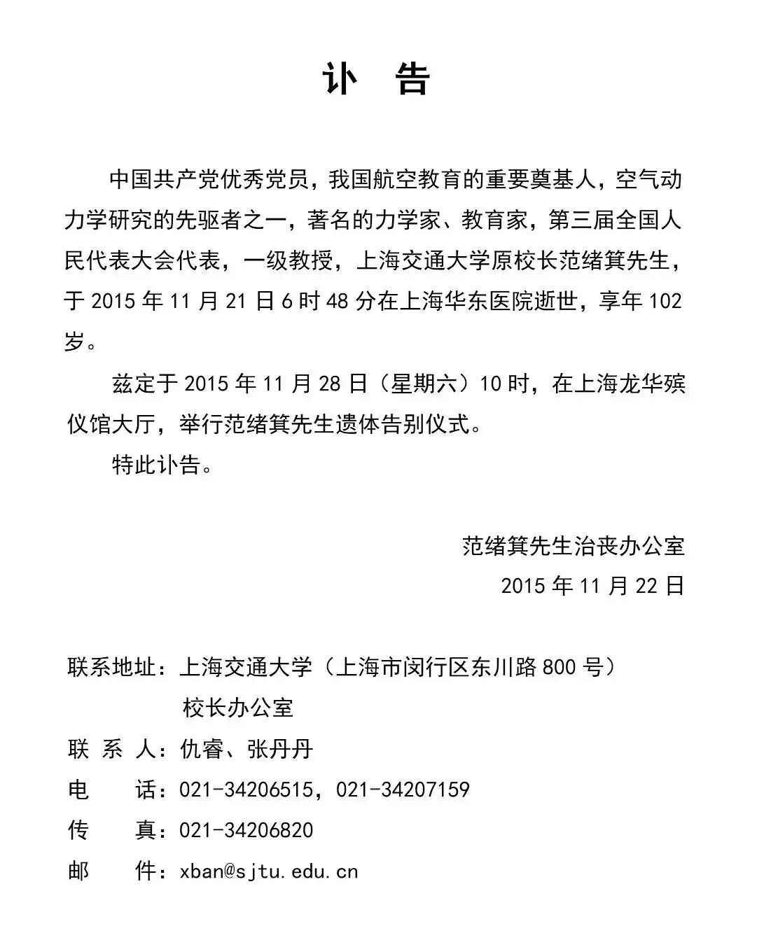 中國共產黨優秀黨員,我國航空教育的重要奠基人,空氣動力學研究的先驅者之一,著名的力學家、教育家,第三屆全國人民代表大會代表,一級教授,上海交通大學原校長範緒箕先生,於2015年11月21日6時48分在上海華東醫院逝世,享年102歲。
