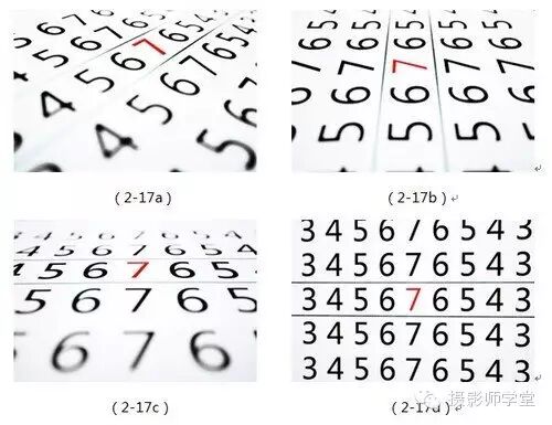 我們的要求是,在紅“7”清楚的前提下,怎樣讓其他這行的字都盡可能的模糊。這是我在課堂上和大家玩的遊戲,開始的時候,大家會拍出各式各樣的照片,比如圖2-17,經過十分鍾的努力嚐試後,有的學生得到了這個實驗的正確答案。圖2-18是我拍攝的比較接近要求的圖片,大家可以參考一下。