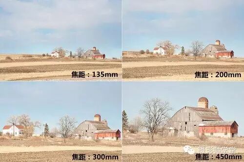 焦距在物理中是指透鏡中心到平行光聚集點的距離;而在攝影中,是指當對焦在無窮遠時,鏡頭中心到感光器成像平麵的距離。因此,隻要知道鏡頭的焦距是怎樣影響拍攝效果的就可以了。圖2-1就是不同焦距拍攝。