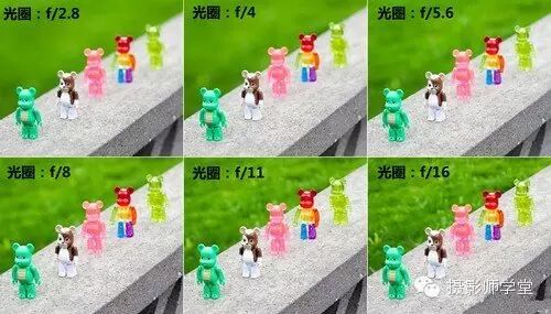 我們對焦在白棕小熊,但是可以發現,前麵的暗綠色小熊,後麵的粉色小熊以及彩色小熊都很清楚。所以畫麵中,雖然絕對清楚的平麵隻有對焦平麵,但是相對清楚的範圍卻可大可小。影響景深的一共有三個參數,分別是:光圈值,焦距以及對焦距離。光圈值剛剛講過;焦距在本章的第1節有提到,反映拍攝畫麵角度的參數;而對焦距離(很多人剛開始會把它和焦距弄混淆)即相機底片平麵與焦平麵的距離。三個參數影響景深的方式我們可以總結為: