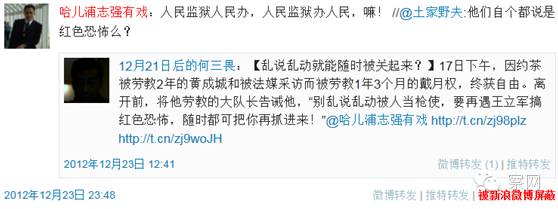 2012.9.23日01:08:08,“哈兒浦誌強有戲”稱:“中國就是野蠻國家,從高層如薄古夫婦和王立軍,到打傷日係車主李建利的西安暴徒,無不野蠻凶殘,日本示威者給咱如此定位,我心服口服。”