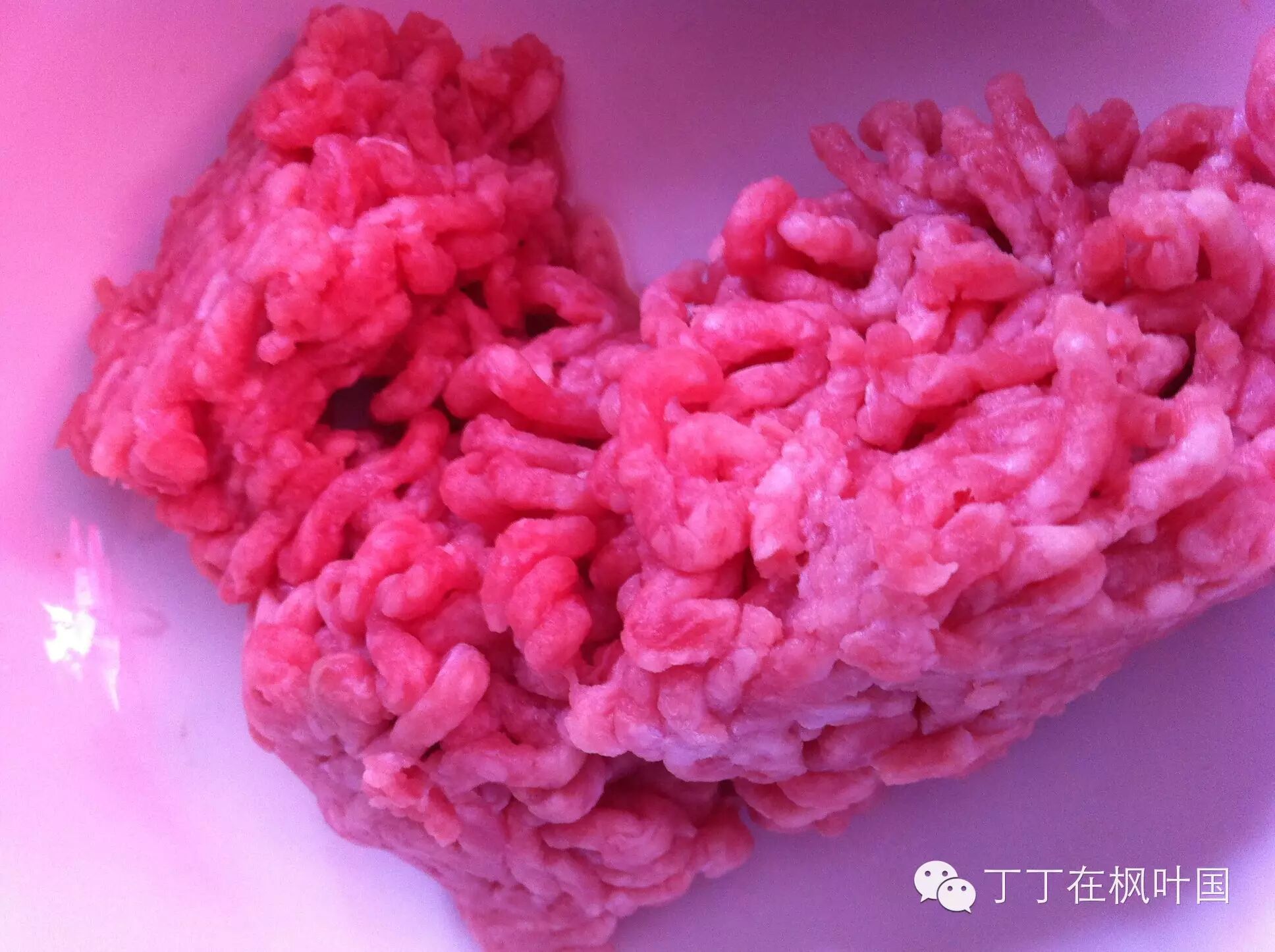牛肉餡兒,瘦的比較好,肥的煎、烤的時候出油太多。這個看著是粉的,一是光用的不好,拍照技術有限,另外也是趕上Costo小牛肉(veal)餡兒打折,顏色本身也淺。不是非小牛肉不可,牛肉都行。我不是那種特講究的人。