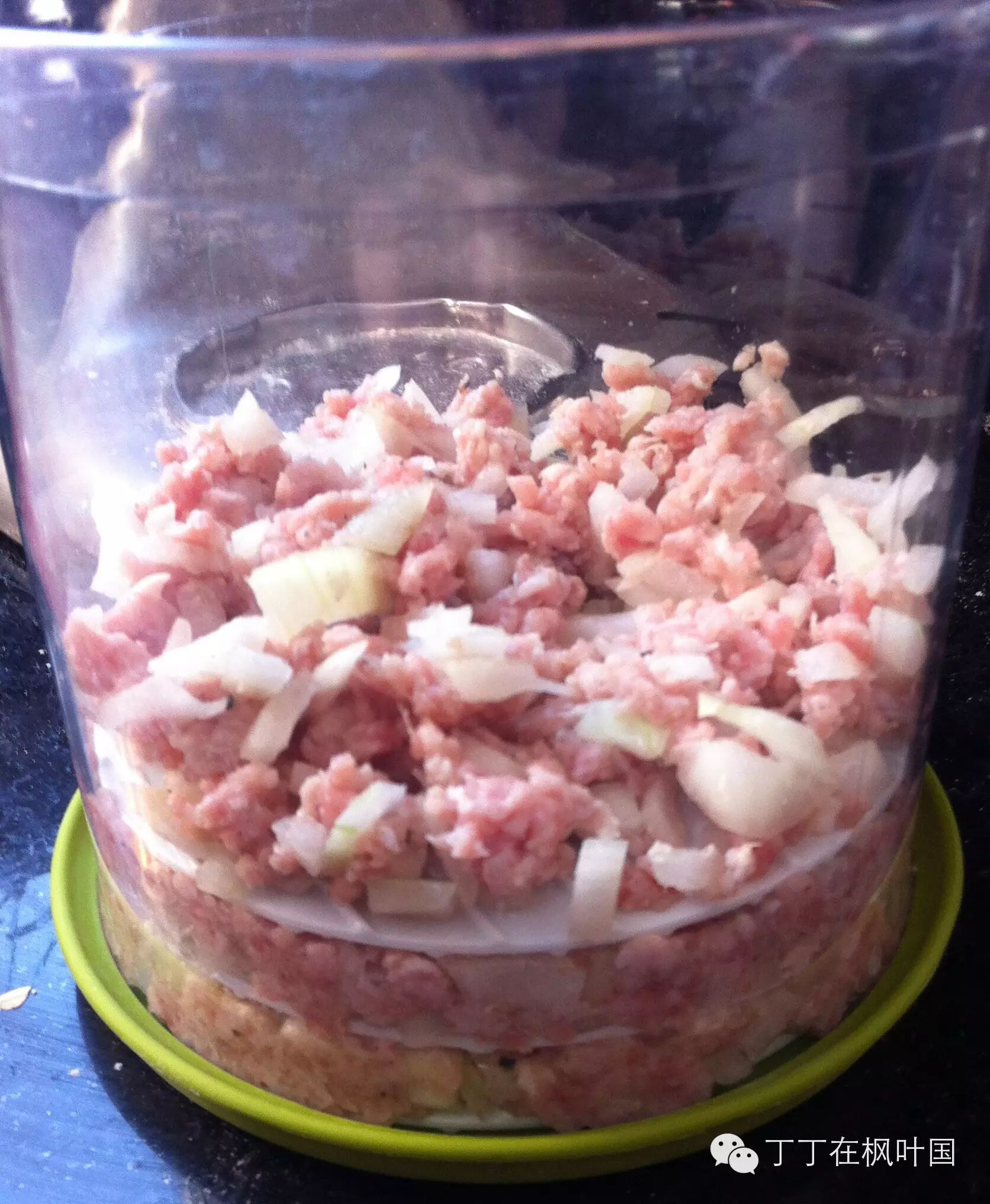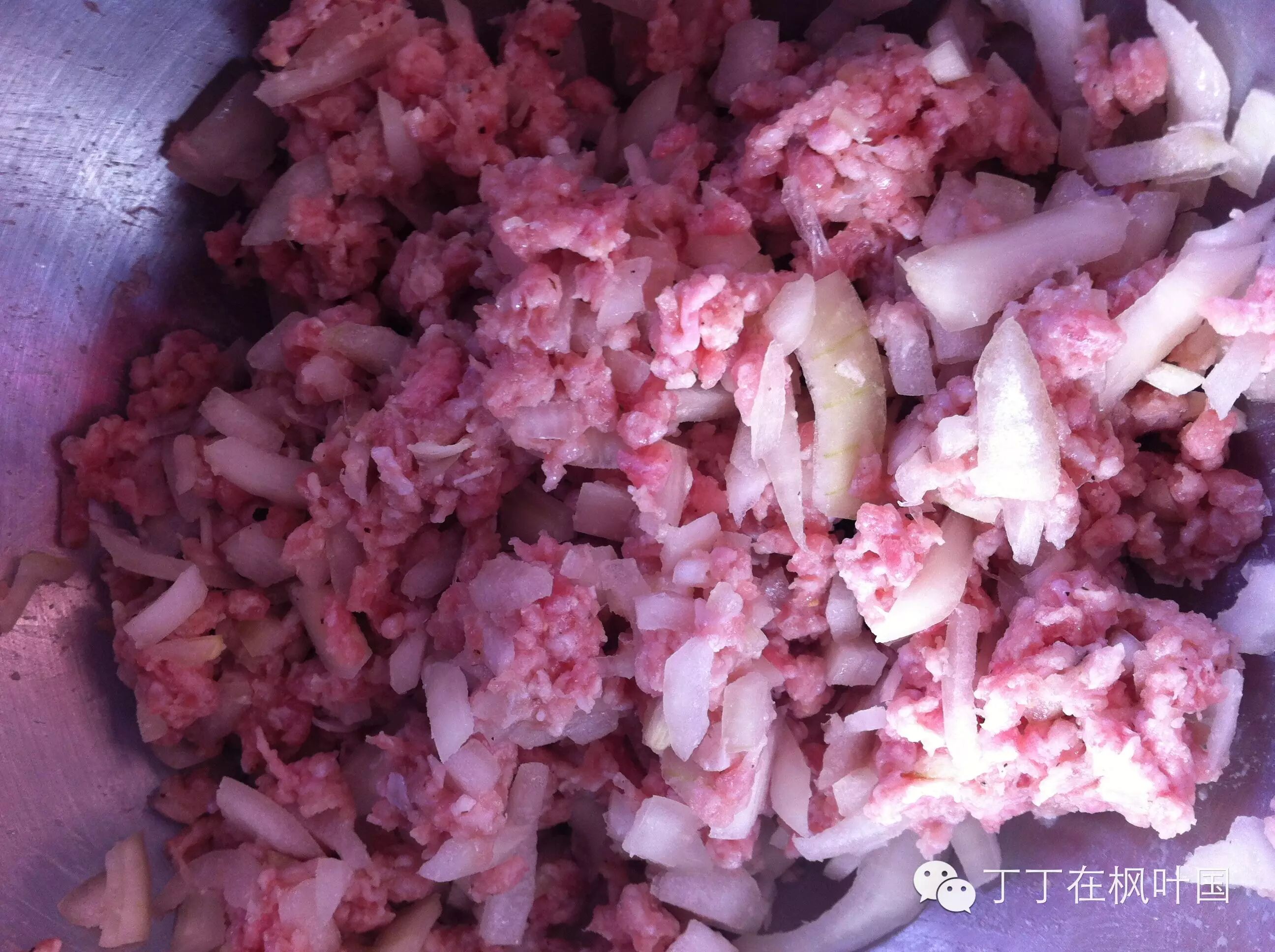 洋蔥要切成碎兩三毫米見方的碎丁。汁多肉嫩主要靠它。下麵的圖裏能看出來,我切的也不太符合自己的要求。