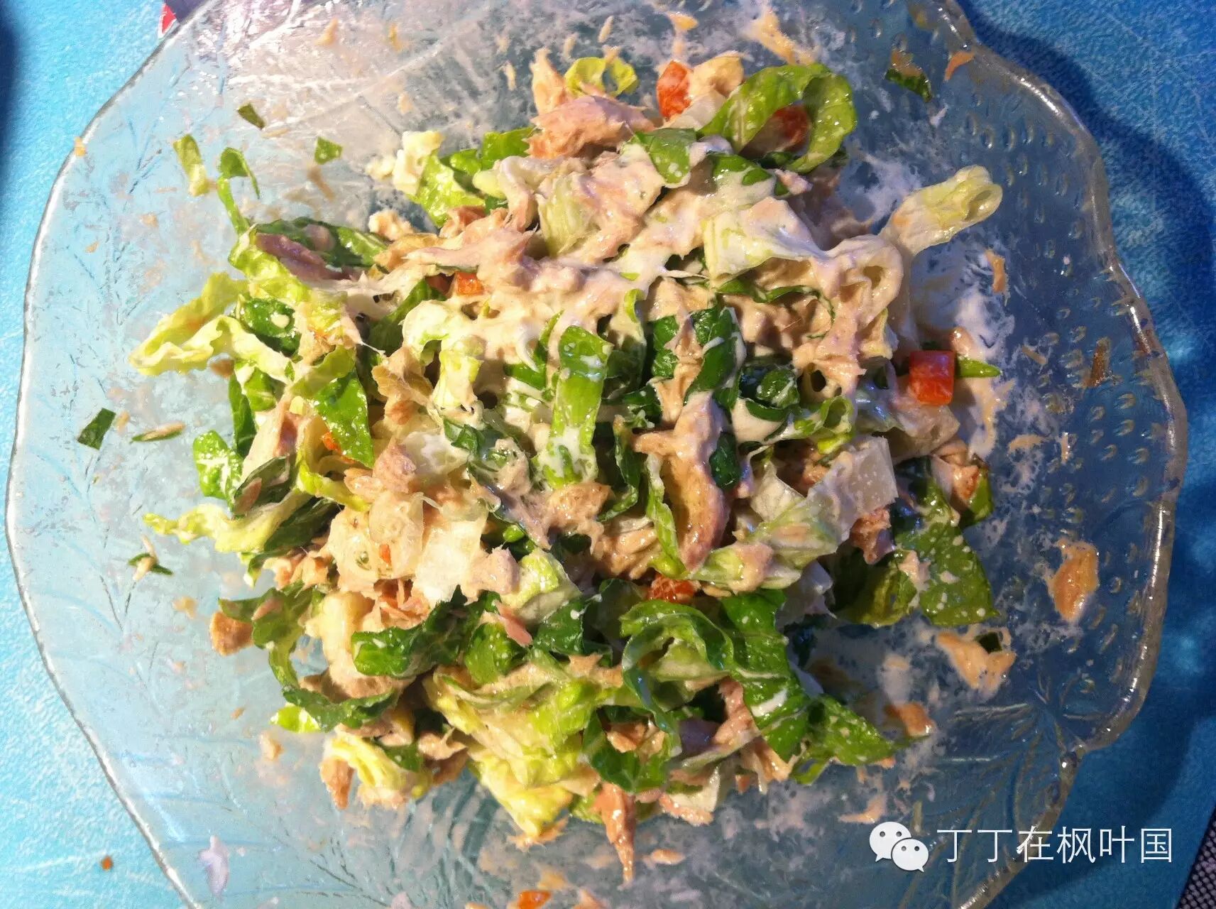 這個金槍魚醬還可以放在梳打餅幹上。家裏有小朋友們來玩兒的時候可以做成餐前小吃,也非常受歡迎。生菜要是不切那麽碎,比例稍微大點兒,也就是少放點兒金槍魚和蛋黃醬,就是一道金槍魚蔬菜沙拉了。