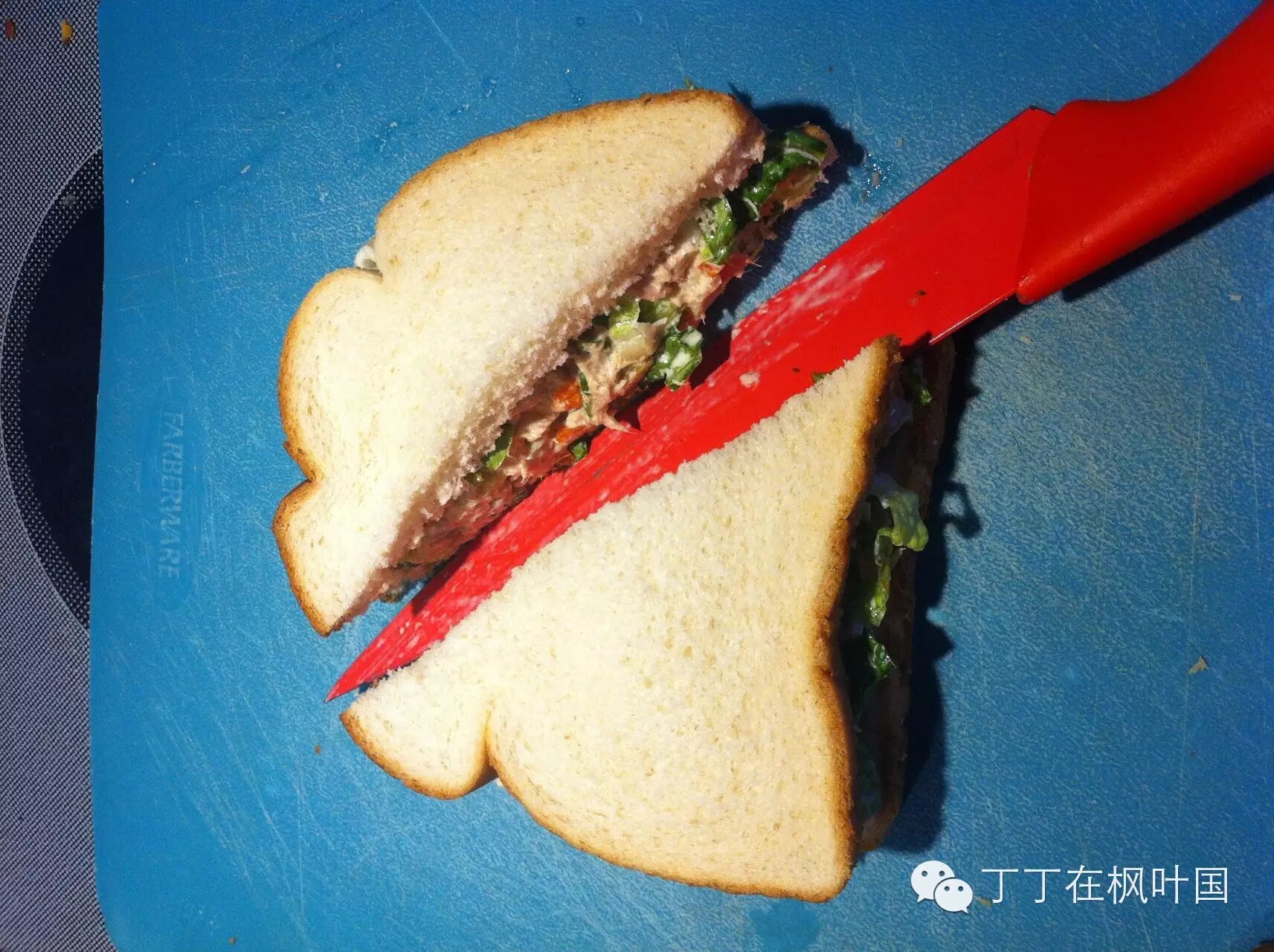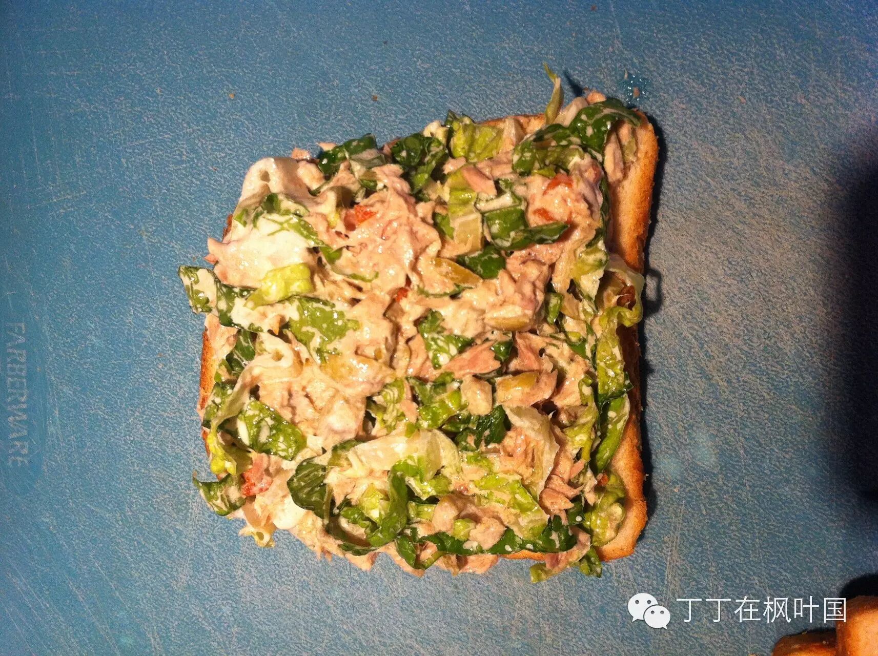這個金槍魚三明治是丁丁最愛的午飯之一,很久沒給他做了。夏天出去野營的時候我也經常會準備好原料,現場操作一次,大人孩子都喜歡。
