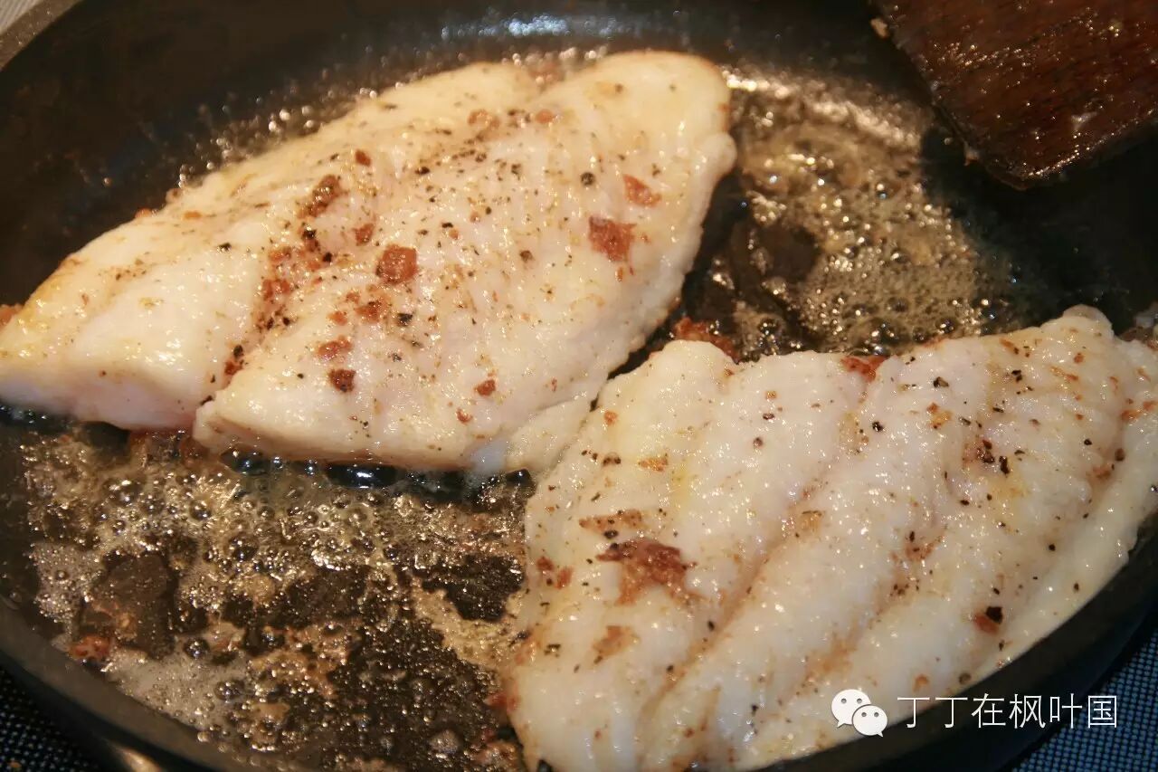 厚底鍋加熱比均勻。黃油加熱後溫度不要太高,可以放洋蔥碎或蒜末煎成金黃色,也可以不放,再把魚排放進鍋裏小火將魚的兩麵煎成金黃色,翻動的時候要小心不要碎了。
