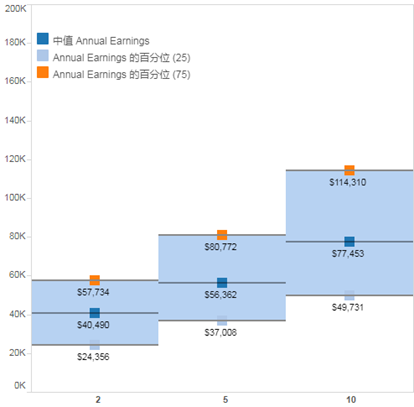 上圖展示了加州大學畢業2年,5年,和10年的平均年薪。2年畢業生的年薪中間值是40,490美元,5年畢業生的年薪中間值是56,362。10年的是77,453美元,畢業生年薪的前25%的中間值是114310美元。