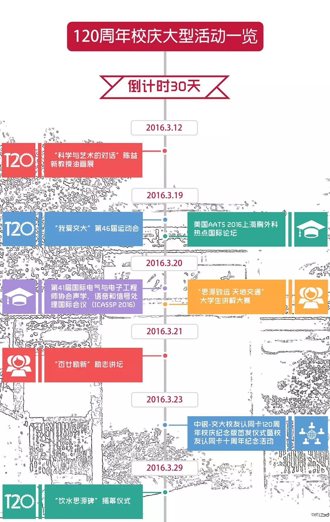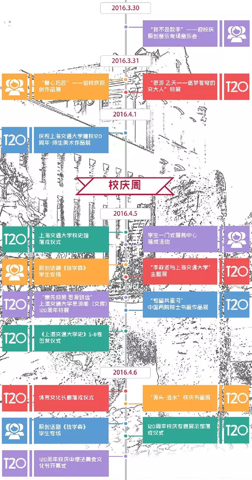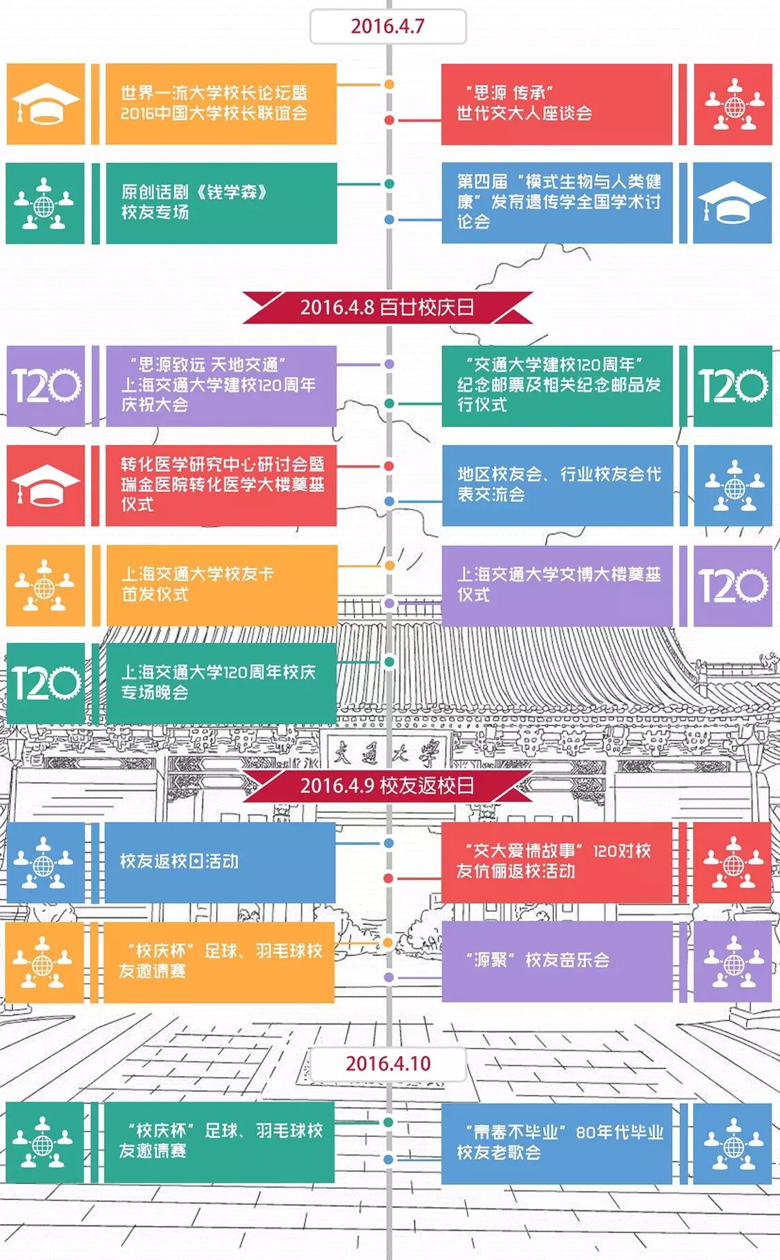 上海交通大學,將於二O一六年四月八日,迎來一百二十歲華誕。值茲佳日,誠邀寰球曆屆校友,會集校園,以誌慶賀;切盼社會各界人士,蒞臨盛舉,與世盡歡。