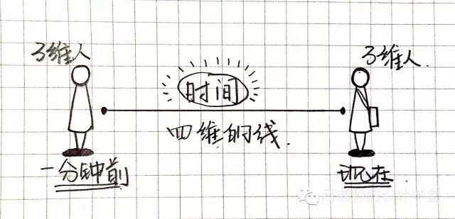 想象一下,左邊有一個1分鍾之前的我,右邊則是現在我,將這“兩個我”看成兩個點 ,穿過他們連線,它就是四維空間裏的線。太棒了,四維空間出現了!