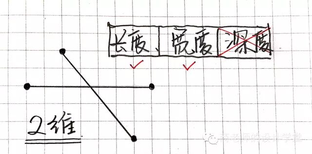 我們擁有了一條線,也就是擁有了一維空間。如何升級到二維呢?很簡單,再畫一條線,穿過原先的這條線,我麽就有了二維空間,二維空間裏的物體有寬度和長度,但是沒有深度。你可以試一試,在紙上畫一個長方形,長方形內部就是一個二維空間。