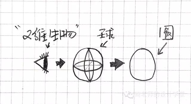 維空間沒有深度(也可以理解成厚度),隻有長度與寬度,我們就可以將它理解成“紙片人”,或者是撲克牌K.J.A Q裏的畫像。因為維度的局限,這個可憐的二維生物也隻能看到二維的形狀。如果讓它去看一個三維的球體,那麽他隻能看到的是這個球體的截麵,也就是一個圓。