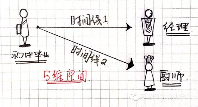 還是拿“經理的你”和“廚師的你”舉例子,廚師的你感覺日子很艱辛,每天油煙嗆人,你想成為經理,安安靜靜在辦公室裏坐著。怎麽辦?五維空間中,你可以穿越到你初中畢業的時候,告訴以前的你,一定要繼續讀書,上高中,考大學,做白領。不過這很費力,而且風險很大,初中畢業的你需要作出不同的選擇,每一種選擇都會產生一個新的時間線,一個不同版本的未來。