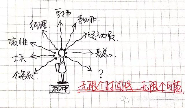 不懂?沒關係!例子舉起來!比如說,你大學畢業參加工作,工作了5年,現在是一名經理,那麽四維空間裏你隻能看到大學畢業的你以及成為白領的這條時間線上的你。 如果當初你初中畢業就去學烹飪,現在是一名廚師。那麽這就是另一條時間線上的你。