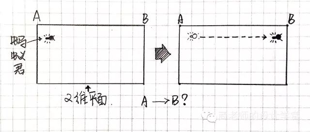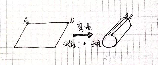 再解釋一遍,在這個圖示上,螞蟻從A點消失,B點出現,你們想想,就是這意思,卷曲產生新的維度!