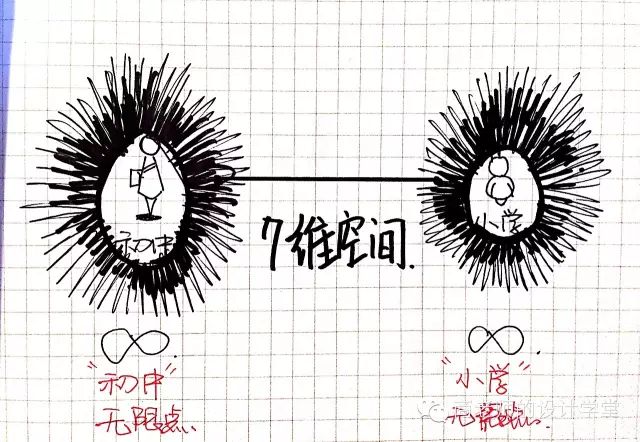 沒關係,我們舉例子,你會懂得。前文中我們提到由“初中畢業的你”為開端而產生的七維無限點;如果你小學畢業的時候就作出不同的選擇呢?每一個選擇又會塑造一個不同的你;那麽以“小學畢業的你”為開端,就會產生另一個包含著無限時間線的點。將這兩點連成一條線,就是七維空間的線。
