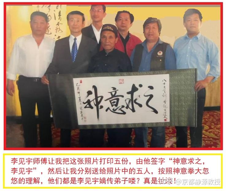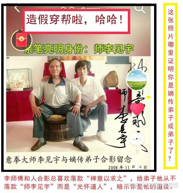 可是,根據我所知:李見宇師傅給任何學生和粉絲和他的合影都喜歡題字“神意以求之”,並且落款一定是“李見宇”三個字,根本沒有“師”字。大家看上麵這張照片中的“師”字是不是不自然和太僵硬、顯然有人是事後補加的?而且正因為是事後補加的,所謂落款位置也不對!證據請見照片和我的文字說明: