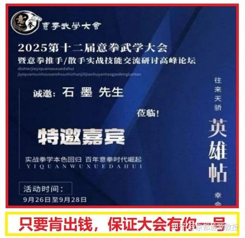 我們看看2025年9月26日至28日召開的“2025第12屆意拳武學大會”,憑借著繳納了讚助費,於是石墨老弟也順理成章地得到了如下一張“入場名片”,也就是可以“入場明著騙”了,見如下: