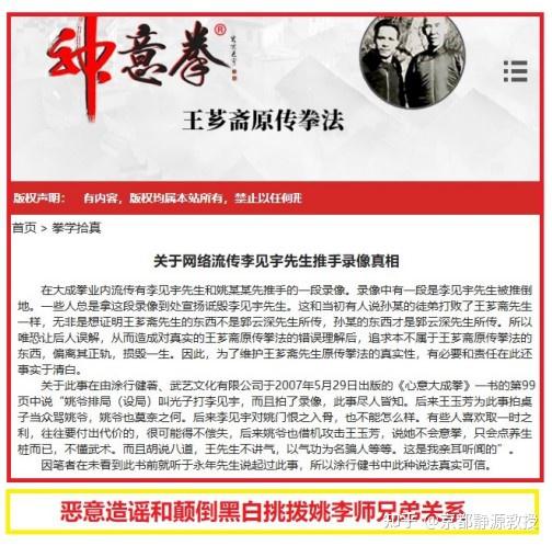 接著我們再看那個神意拳大忽悠在網站上發布的《關於網絡流傳李見宇先生推手錄像真相》一文。截圖如下: