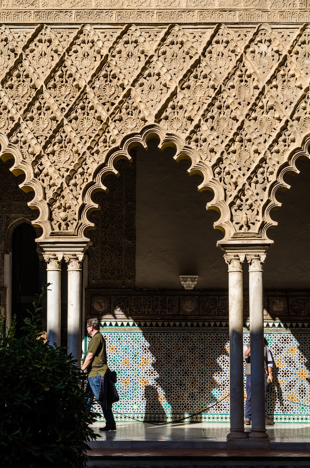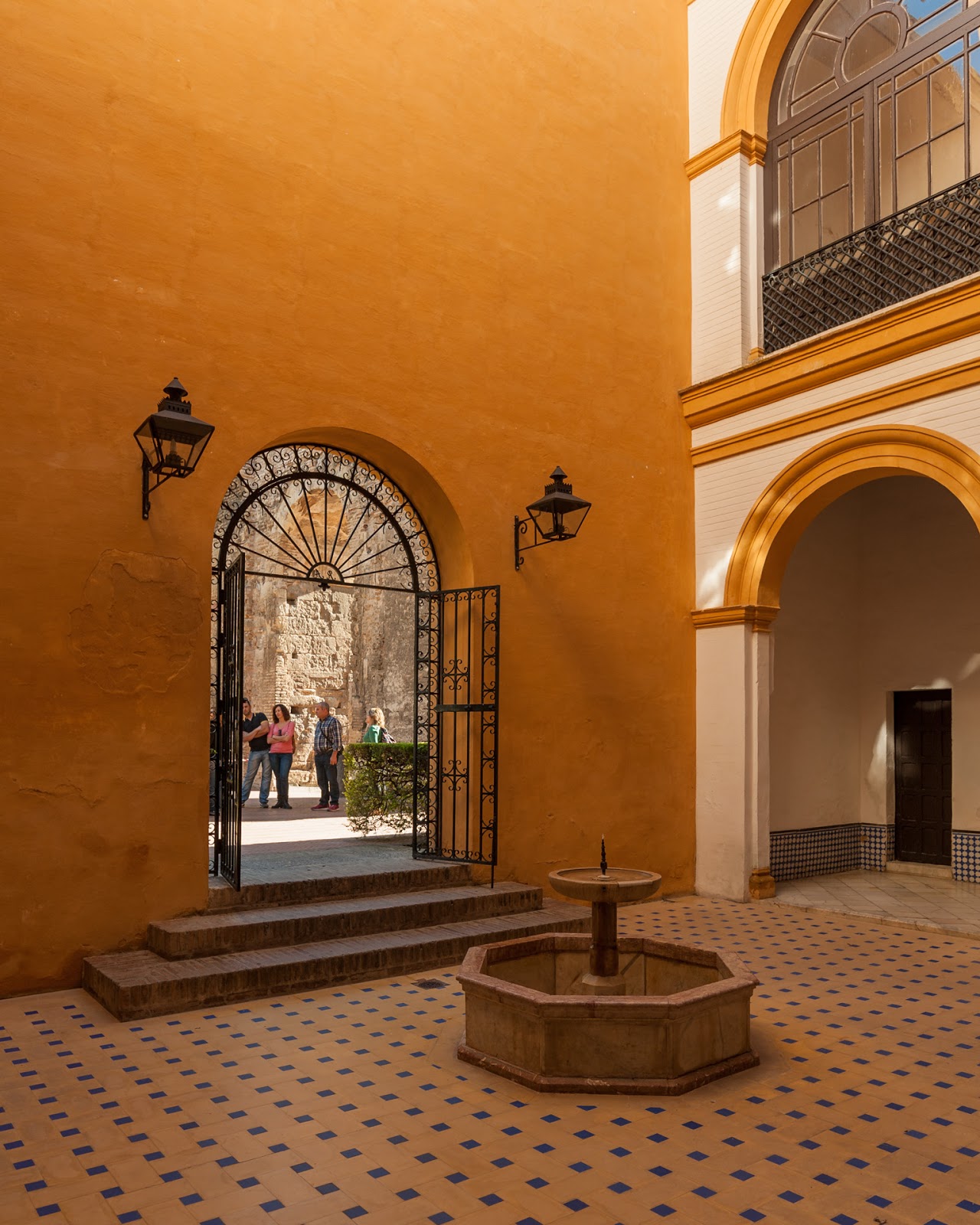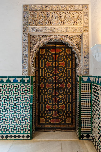 Decorative wooden door and tiled walls inside the Patio de las Munecas