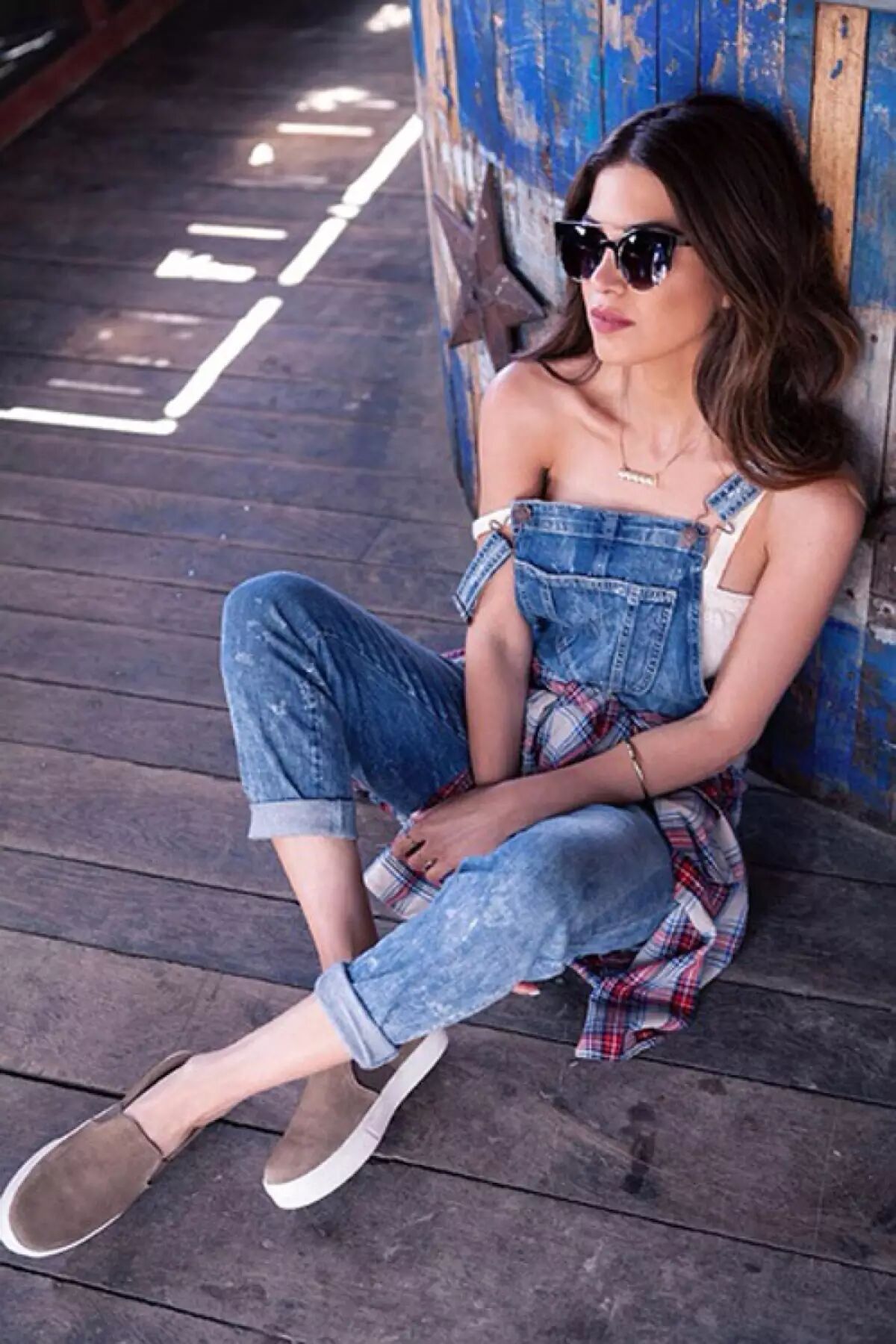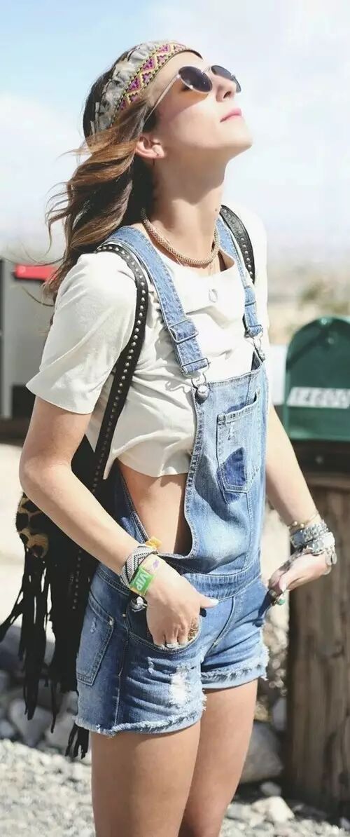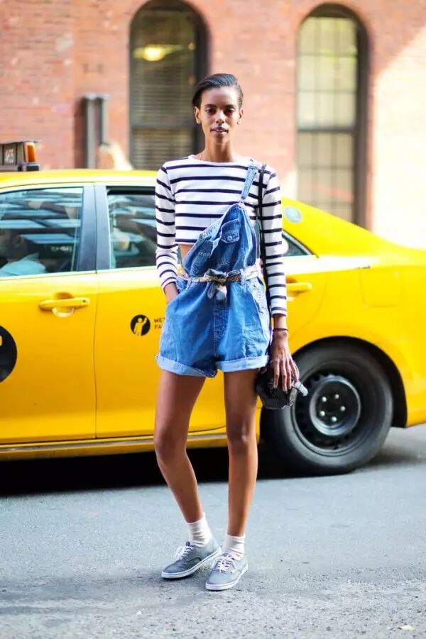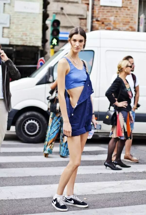 搭配露出一截腰腹的Crop-top,絕對是超模最熱衷的背帶搭法。(最重要的是,平時不敢穿露腰款的你還能借機遮小腹哦!)