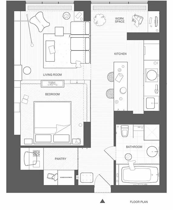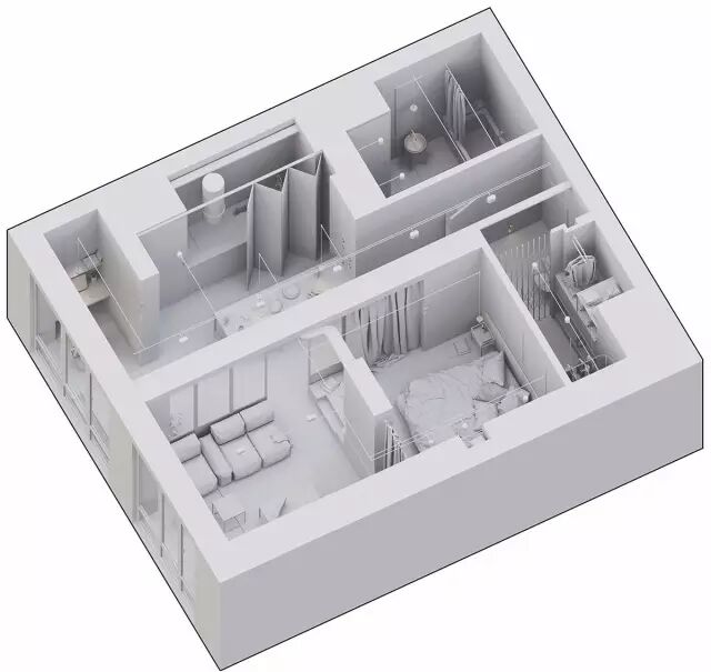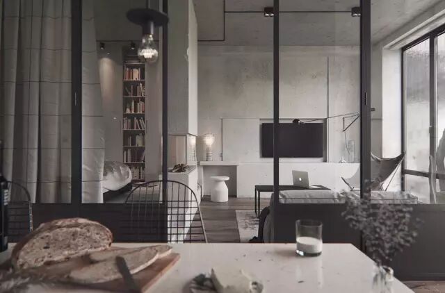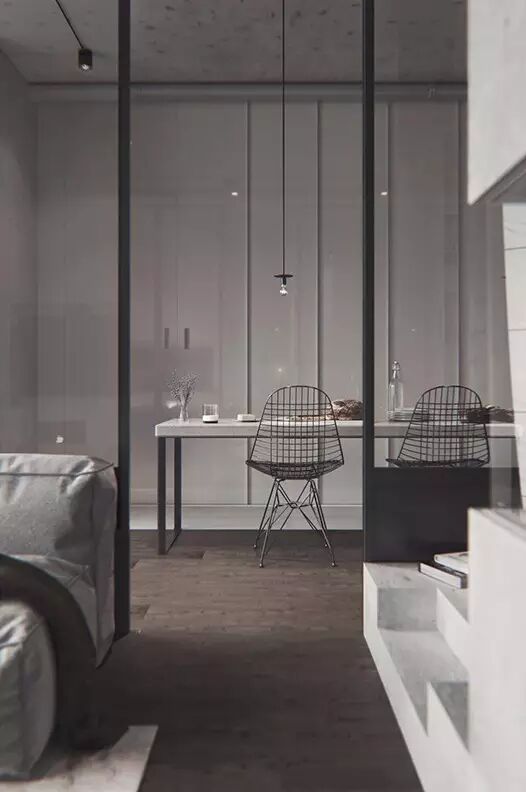這處位於基輔的55平米公寓,主人是一對年輕的夫婦。房間被劃分為六個功能區域:客廳、臥室、工作區、廚房、儲藏室、衛生間。全部使用天然材料:金屬、玻璃、混凝土、木材,建立一個以黑白灰為主色調的空間。在每一個房間都能接觸到陽光,使得如此硬朗的風格並不隻有冷冰冰。