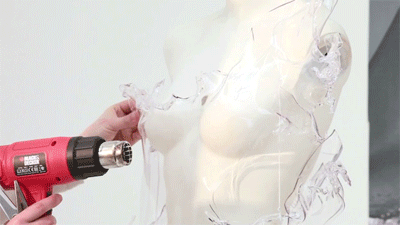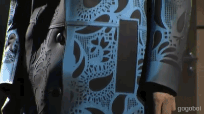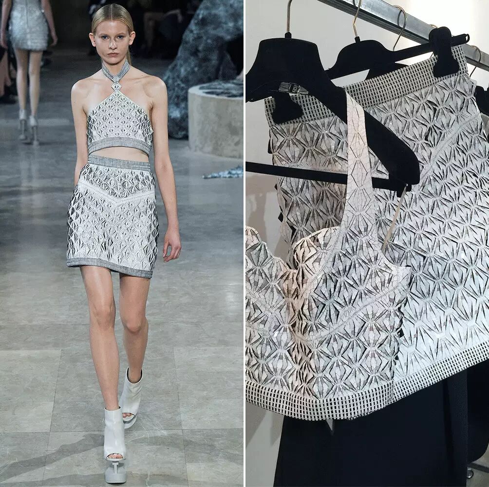 麵料裏織進了記憶合金的纖維,在一定溫度下成型,回到常溫就會開始變化。具體的文科生博主也不太明白,反正不明覺厲就是了。