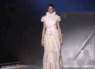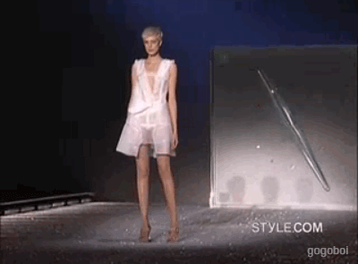 設計大師Hussein Chalayan花樣玩得更多,他的作品跟變形金剛一樣,讓人簡直不敢相信自己的眼睛。 走著走著,用力一扯,彈出一條新裙子。