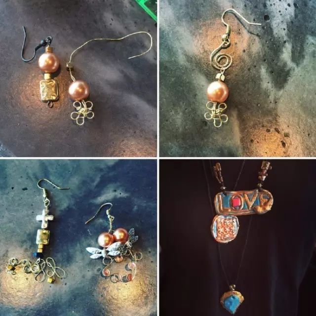 從各種包包、陶藝到身上戴的各種飾品, 甚至衣服,樣樣都是老徐手作!