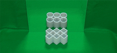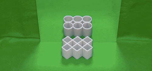 重新看一下第2張GIF,你將看到左邊的模型由4個規整組合起來的菱柱變成了交錯在一起的4個圓柱。與此同時,右邊由2個菱柱交錯組成的模型,在鏡子裏變成了2個分開放置的圓柱。
