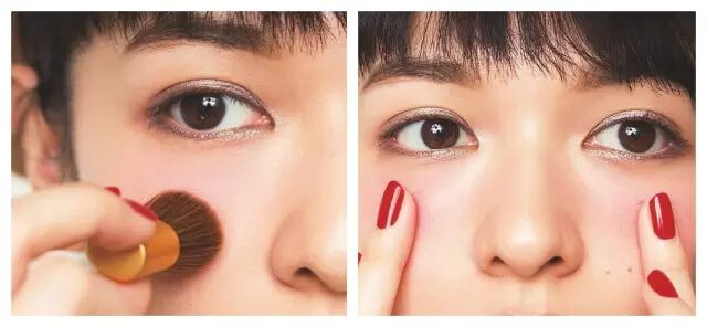 畫法很簡單,將腮紅在眼下三角區掃一遍,再用手指把腮紅暈染開來