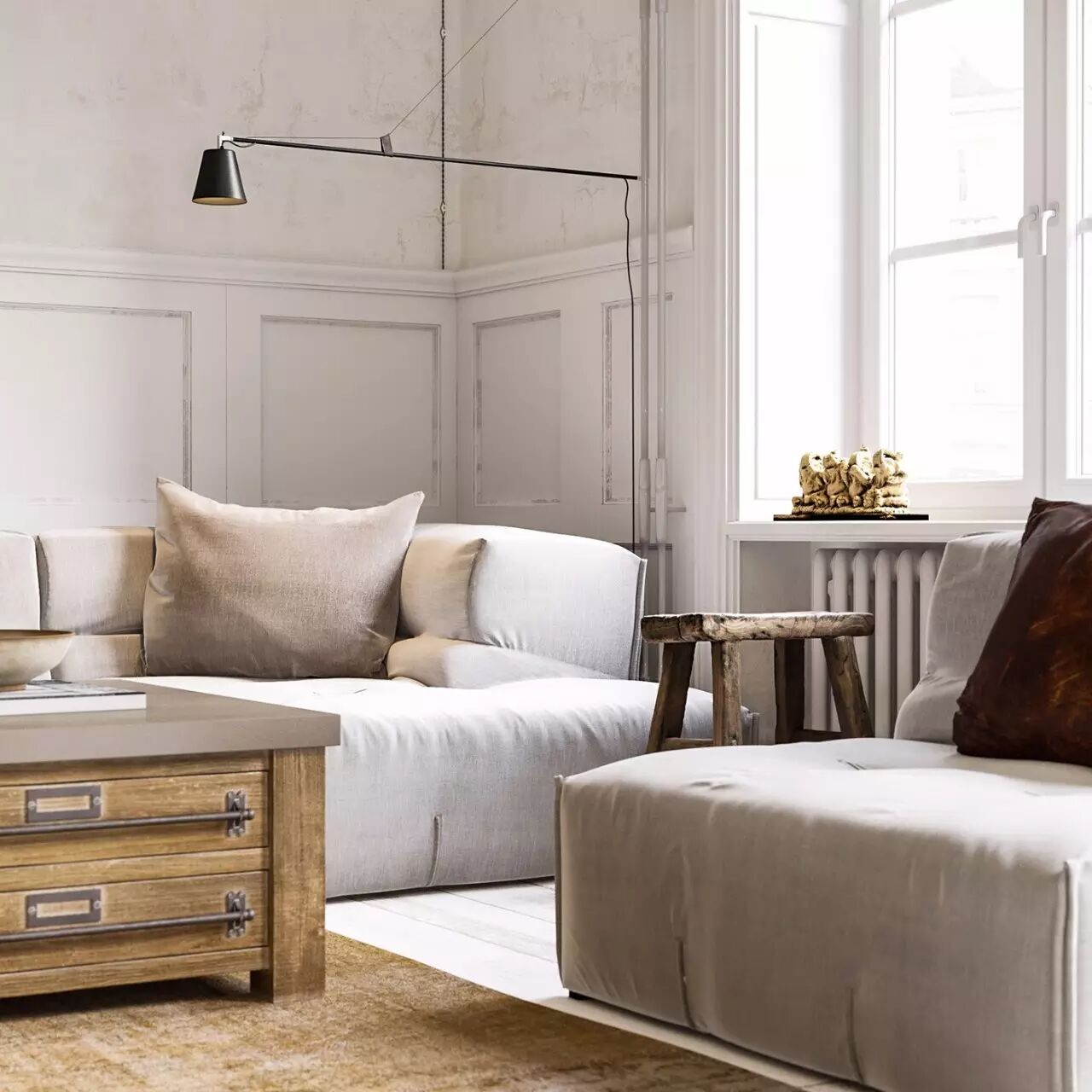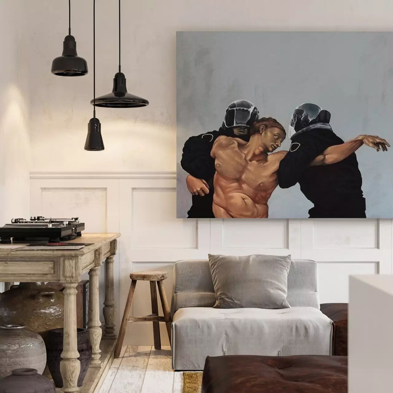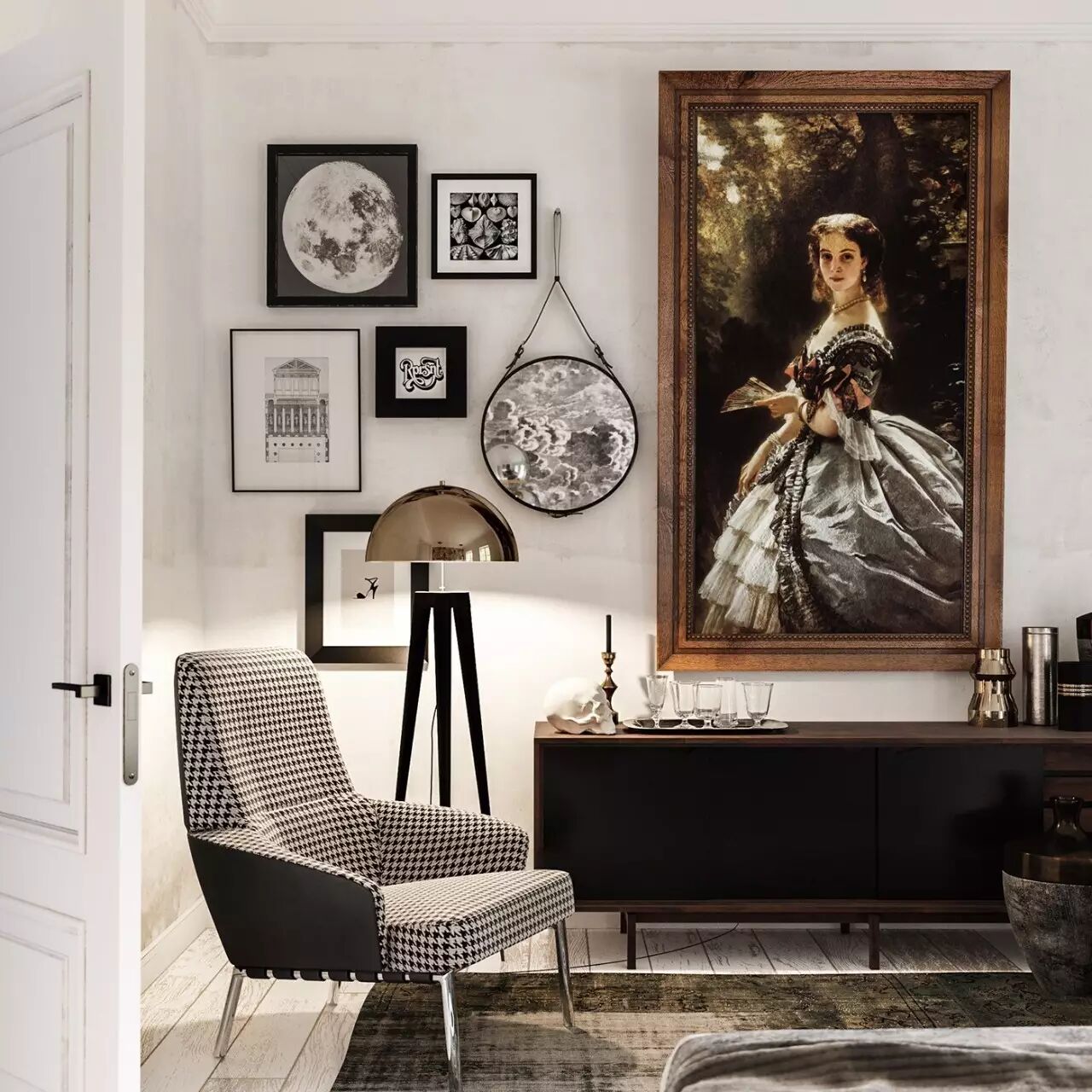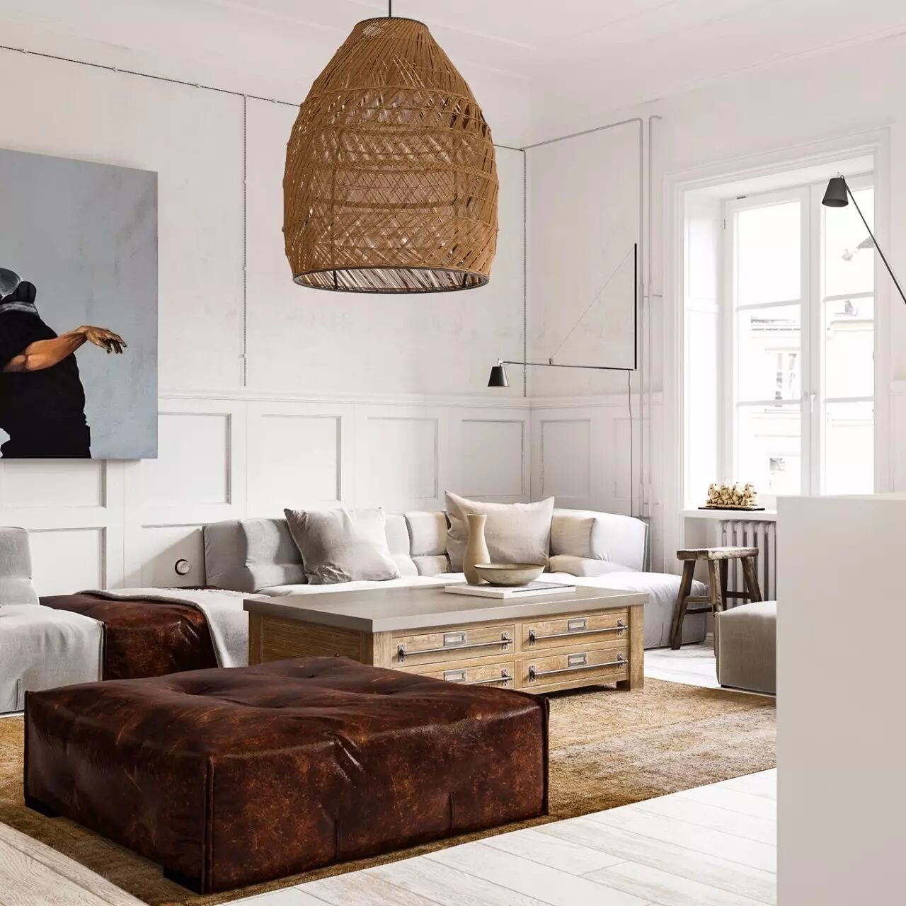 在這個現代的公寓裏,有很多古典美術元素的裝飾。極簡主義和傳統木製兩種不同風格的家具在一個房間中融合。恰當的顏色組合是關鍵,多種材質,多種元素,如圖跨越了幾個時代,卻能和諧共存,給人舒適安逸的感覺。