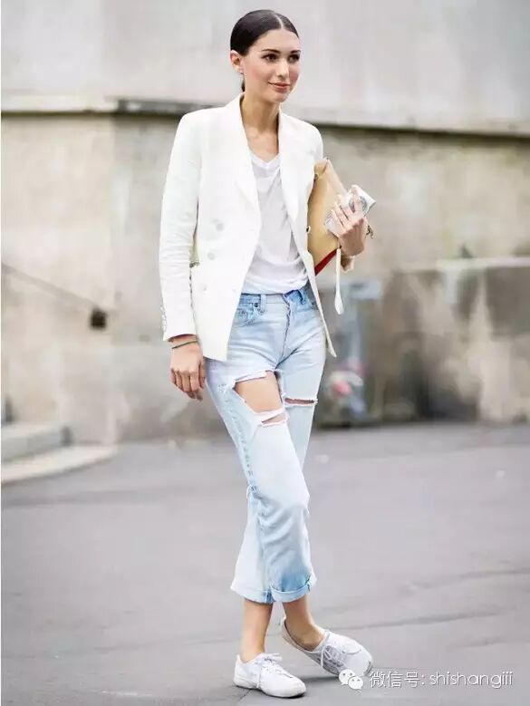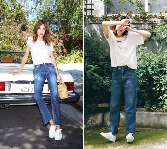 白T白鞋除了百搭也沒啥禁忌,如果你看膩了黑白灰想換個色係的話,下半身褲款不妨從牛仔褲下手