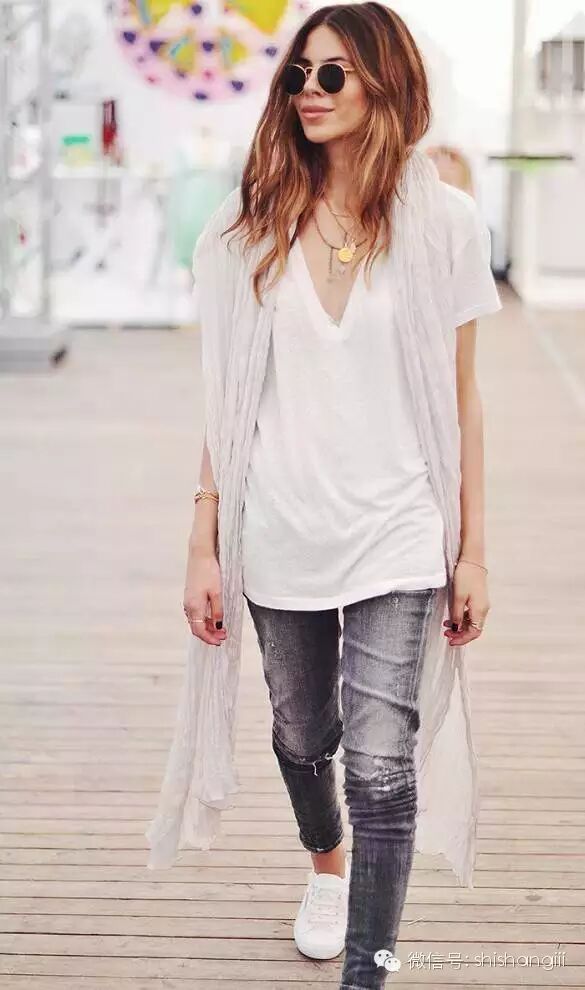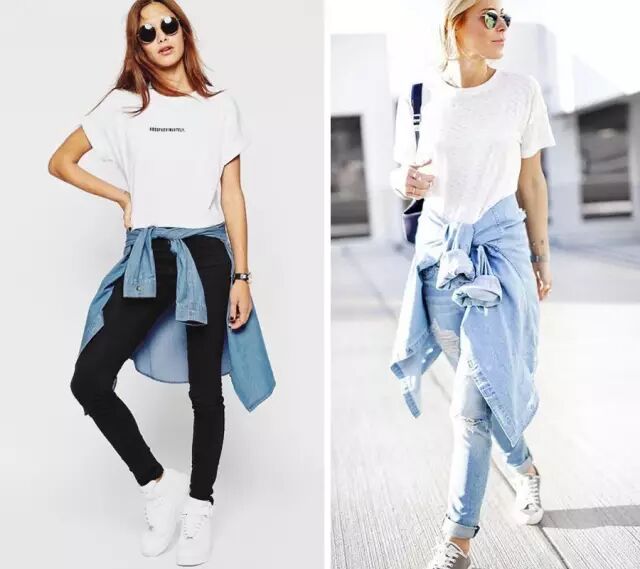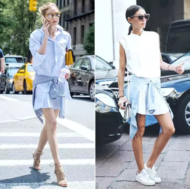 將襯衫簡單地係在腰上,和白T白鞋的休閑感相得益彰。