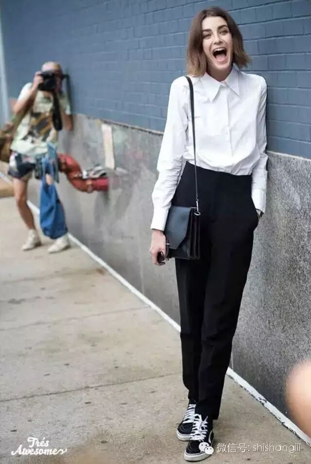 你說不舍得把襯衫這麽“折騰”吧,也行,如果你有一雙令人豔羨的大長腿,循規蹈矩也能美翻,別擔心,把紐扣全扣上,直接跟黑色西褲配,加雙Vans就好了。