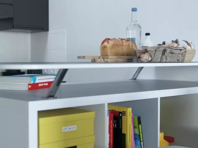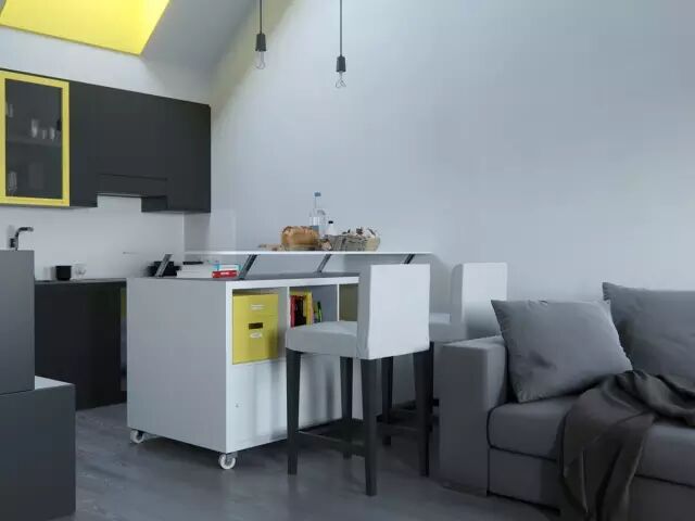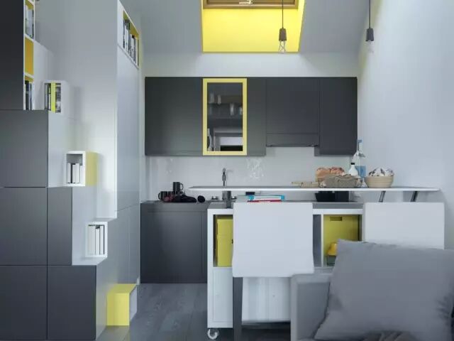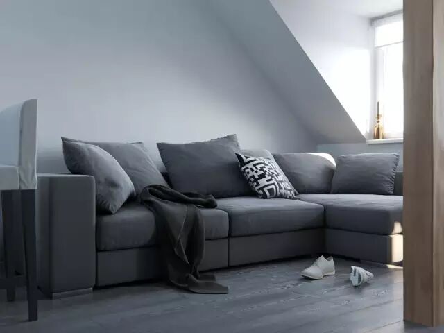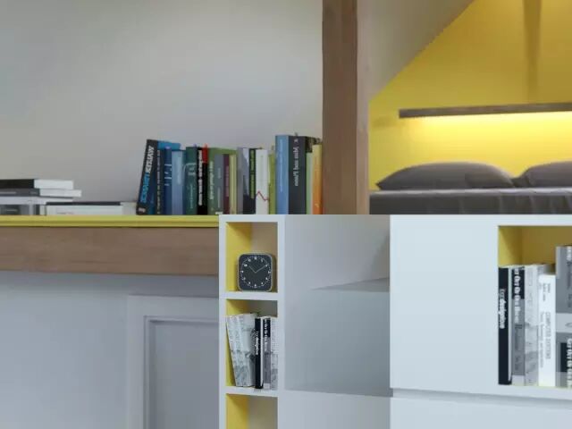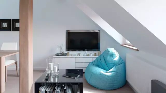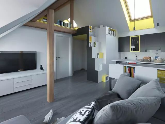 三角屋頂被隔成閣樓,根據季節的變換選擇不同的顏色搭配。極簡的風格能更充分的利用不大的空間。去往閣樓的樓梯與書架相結合,會不會走到半路就沉醉到書的世界裏。